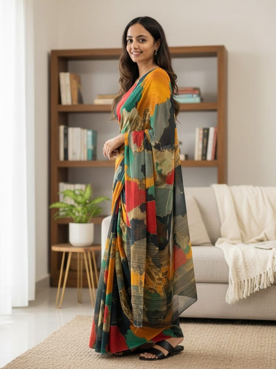 Saree Fabric: Chiffon Saree Length: 5.5 meters Blouse Fabric: Black (unstitched) Blouse Length: 0.8 meters Pattern: Multi-color abstract print Occasion: Casual wear, festive wear, party wear Description Add a splash of vibrant elegance to your wardrobe with this chiffon multi-color printed saree. Designed with a lively mix of hues, the saree offers a modern yet traditional charm. The lightweight chiffon fabric ensures a comfortable drape, making it perfect for day-long wear. Paired with a solid black blouse piece, this saree balances colorful vibrancy with timeless sophistication. Suitable for festive celebrations, family gatherings, or casual events, this saree is a must-have for effortless style.