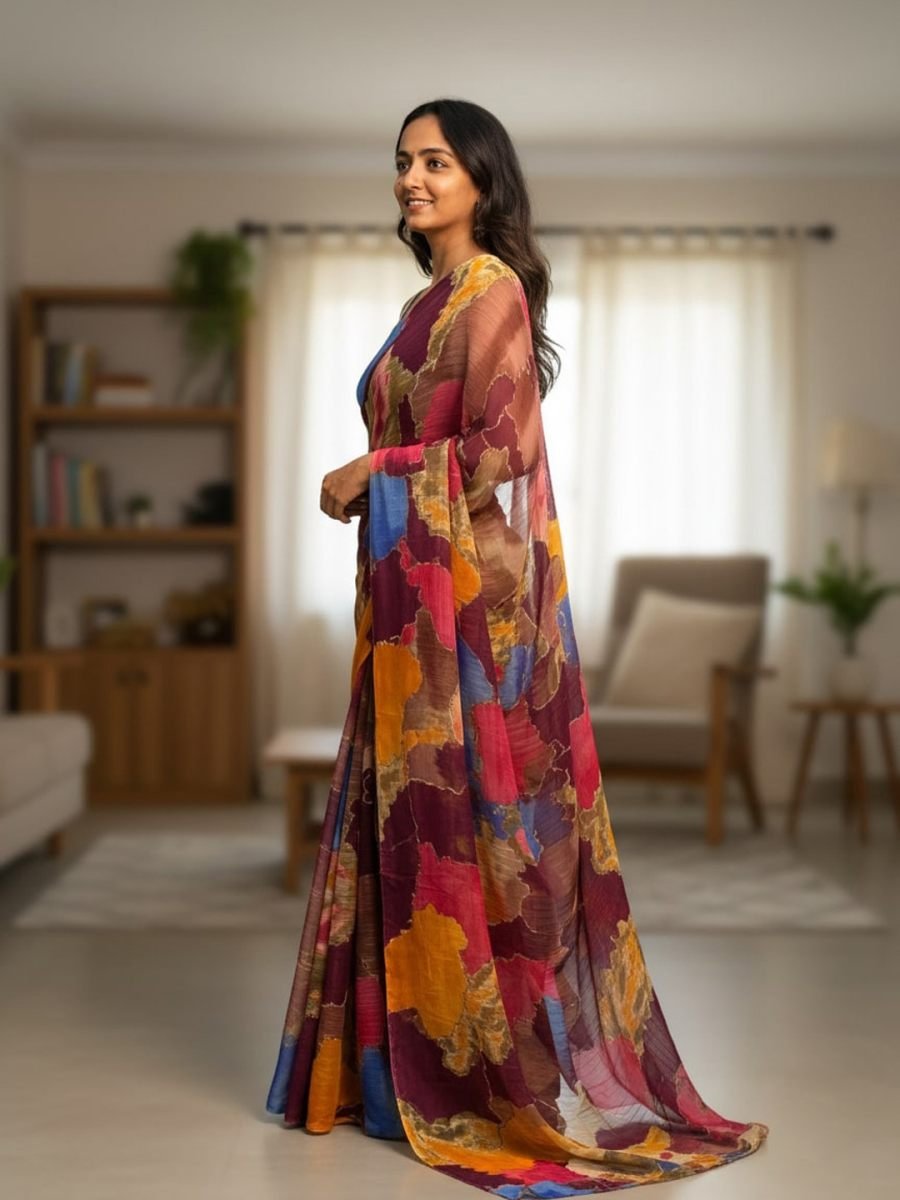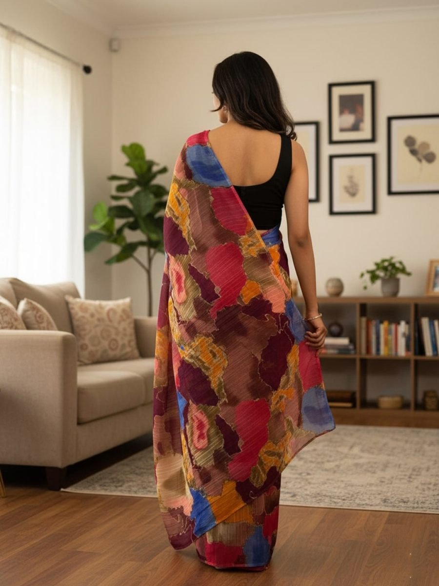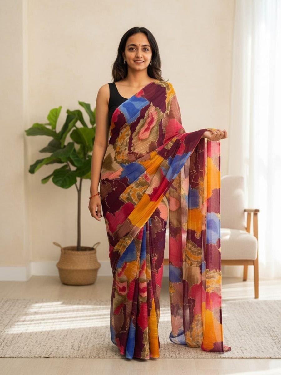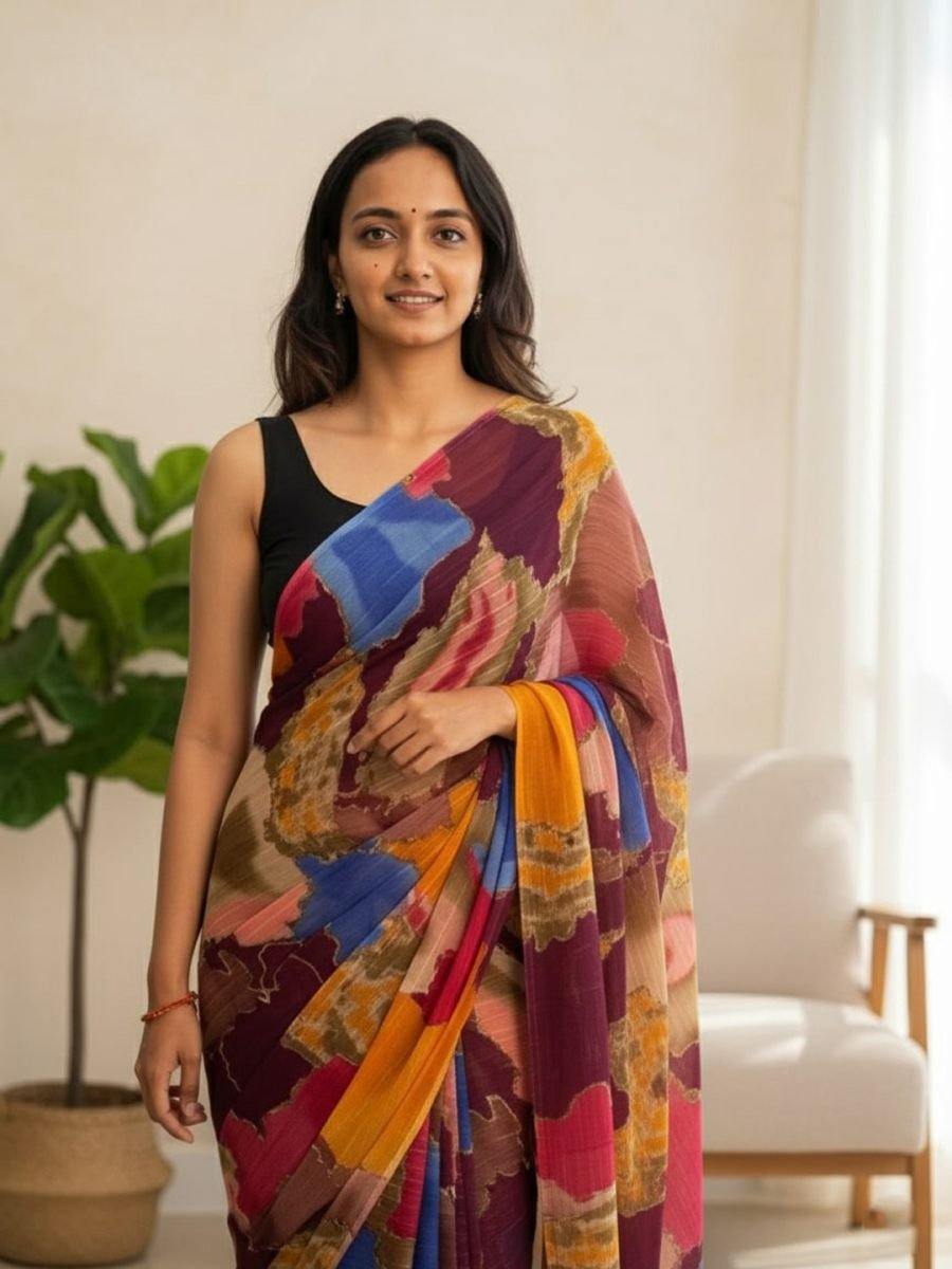 Saree Fabric: Chiffon Saree Length: 5.5 meters Blouse Fabric: Black (unstitched) Blouse Length: 0.8 meters Pattern: Multi-color abstract print Occasion: Casual wear, festive wear, party wear Description Add a splash of vibrant elegance to your wardrobe with this chiffon multi-color printed saree. Designed with a lively mix of hues, the saree offers a modern yet traditional charm. The lightweight chiffon fabric ensures a comfortable drape, making it perfect for day-long wear. Paired with a solid black blouse piece, this saree balances colorful vibrancy with timeless sophistication. Suitable for festive celebrations, family gatherings, or casual events, this saree is a must-have for effortless style.