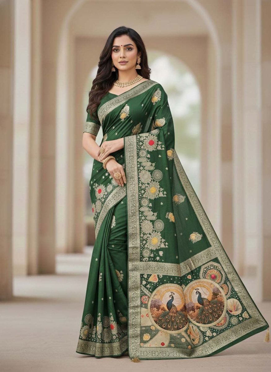 Elegant Bottle Green Dola Silk Saree with Traditional Zari Woven Peacock Pallu Latkans
