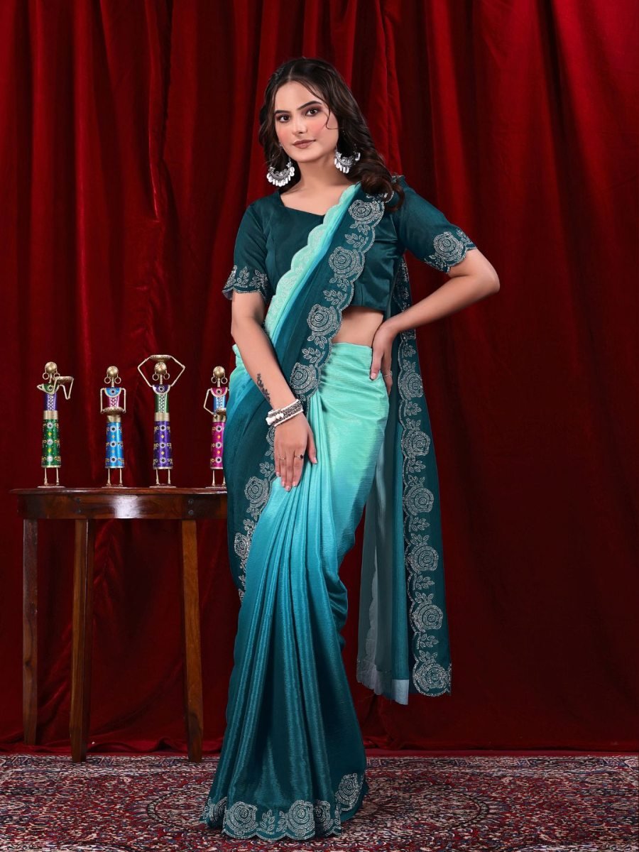 Fabric (Saree): Premium Chinon Work: Siroski Diamond Embellishment Design: Shaded Color Pattern Saree Length: 5.5 meters Blouse Piece: 0.8 meters (Unstitched) Occasion: Party, Wedding, Festive Wear, Special Events Style: Ethnic Glamour | Modern Elegance | Designer Saree Wash Care: Dry Clean Recommended Elegant Chinon shaded saree featuring shimmering Siroski diamond work, paired with an unstitched blouse piece. Perfect for festive celebrations, parties, and weddings.
