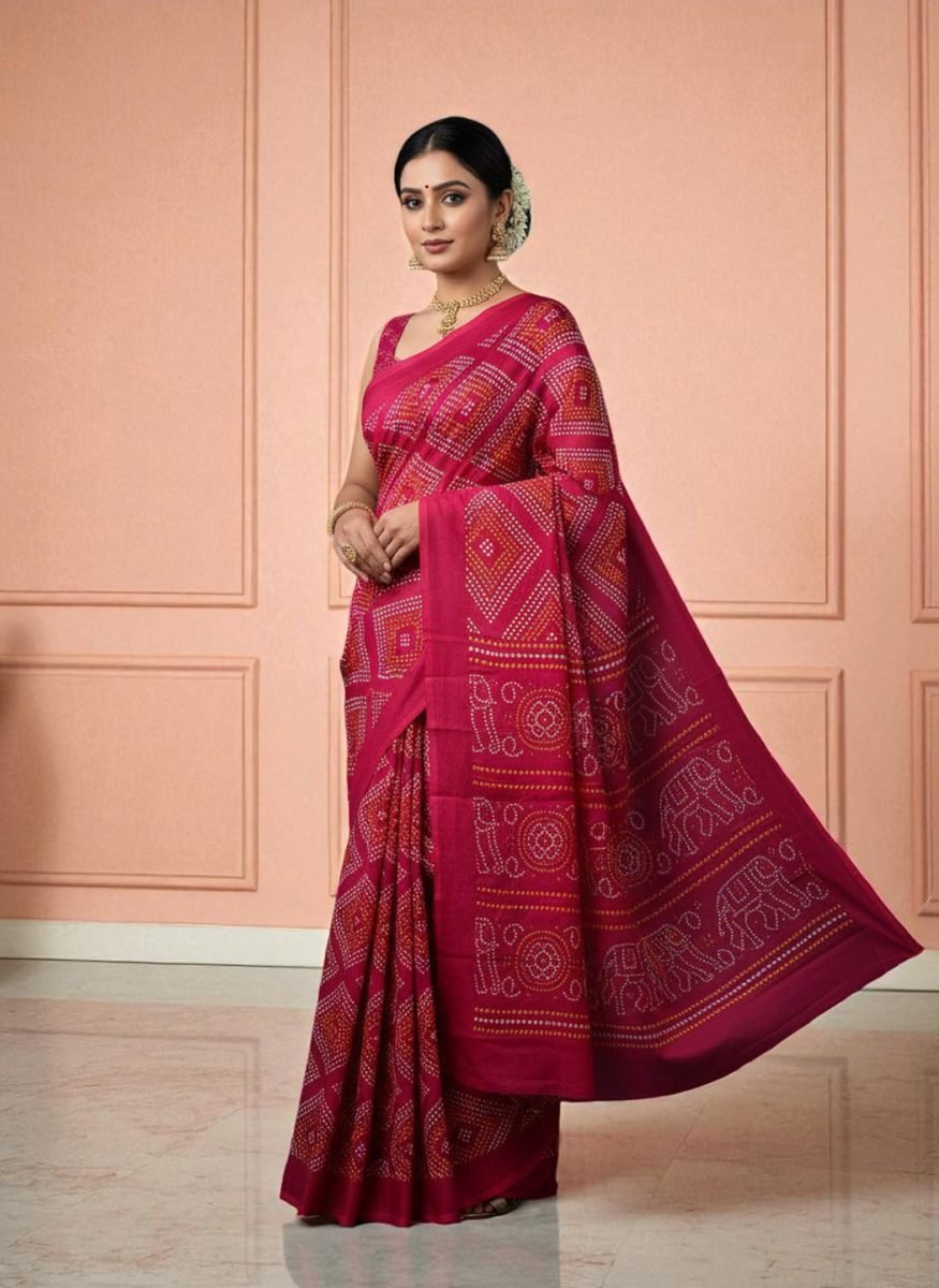 Saree Fabric: Premium Satin Blouse Fabric: Premium Satin Work/Print: Traditional Bandhni (Bandhej) Print Saree Length: 5.5 Meters Blouse Length: 0.8 Meters Blouse Type: Unstitched Occasion: Festive Wear, Party Wear, Wedding Guest, Traditional Functions, Ethnic Wear Wash Care: Dry Clean Only for best results and longevity. Package Contains: 1 Saree with 1 Unstitched Blouse Piece Experience the perfect fusion of tradition and modern luxury with our Satin Bandhni Print Saree. The lustrous, silky-smooth satin fabric drapes beautifully, while the vibrant, traditional Bandhni print adds a touch of ethnic elegance. Ideal for festivals, weddings, and special occasions, this saree comes with a matching blouse piece to complete your stunning look.