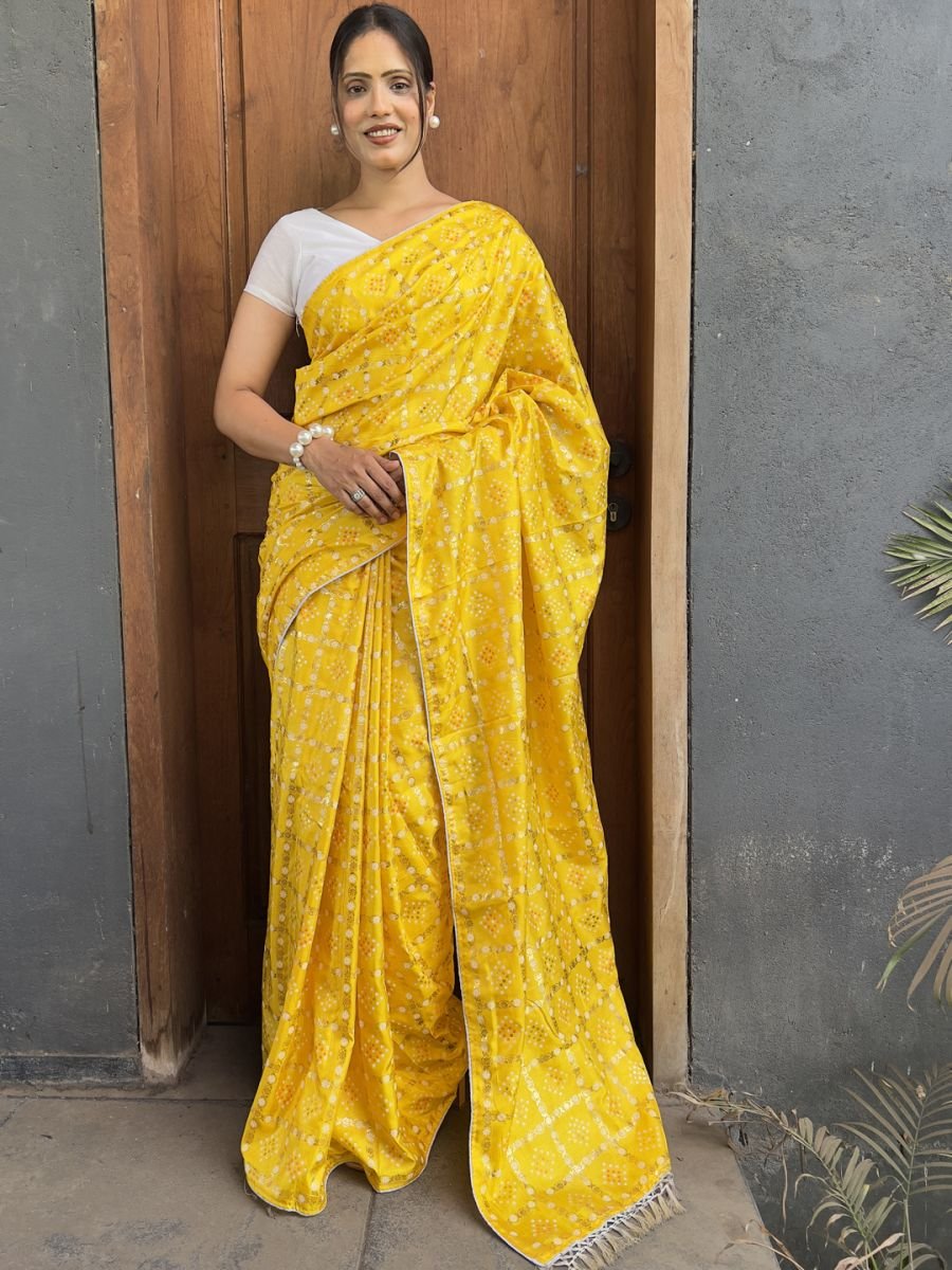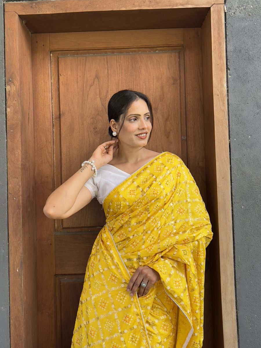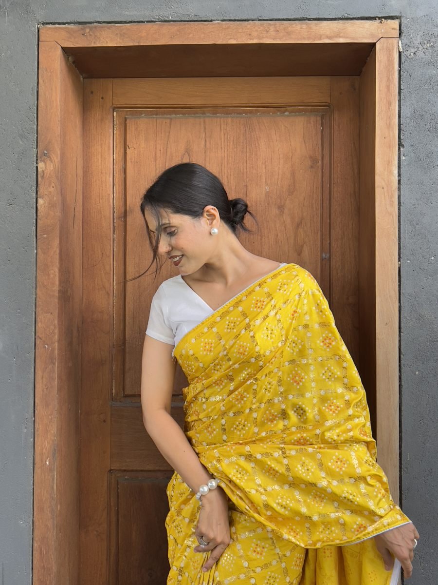 Fabric: Silk Blend Work/Design: Bandhani-inspired floral print Saree Length: 5.5 meters Blouse Piece Length: 0.8 meters (Unstitched) Occasion: Wedding, Festive, Party, Traditional Wear Style: Ethnic, Elegant, Lightweight & Comfortable Care Instructions: Dry Clean or Gentle Hand Wash The vibrant Bandhani-inspired floral prints bring a touch of Rajasthan’s rich heritage, while the soft silk blend fabric ensures comfort for long wear. Whether it’s a festive celebration, wedding function, or party, this saree makes you stand out effortlessly.