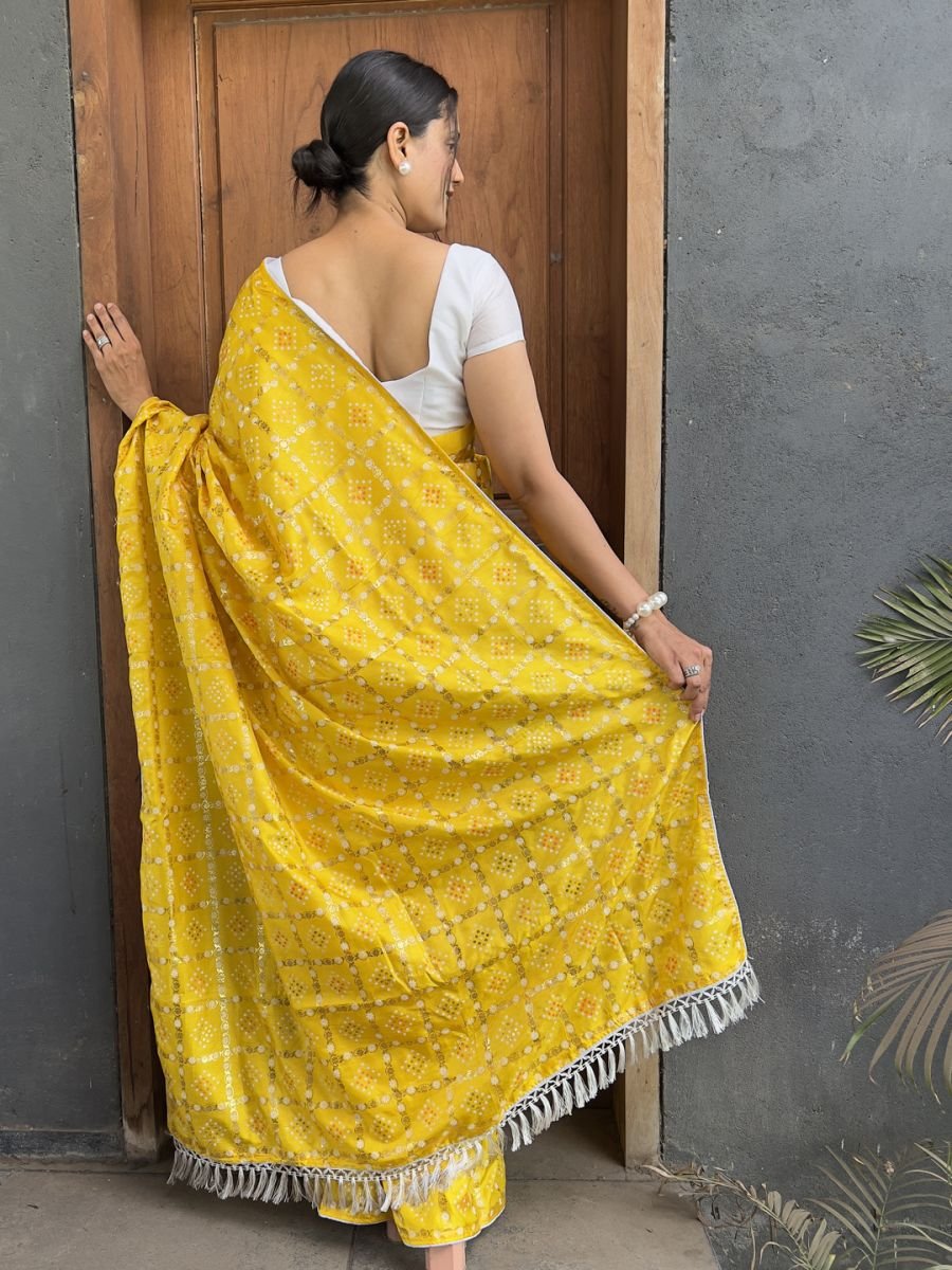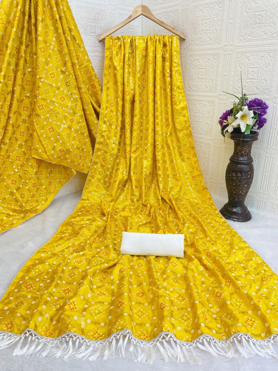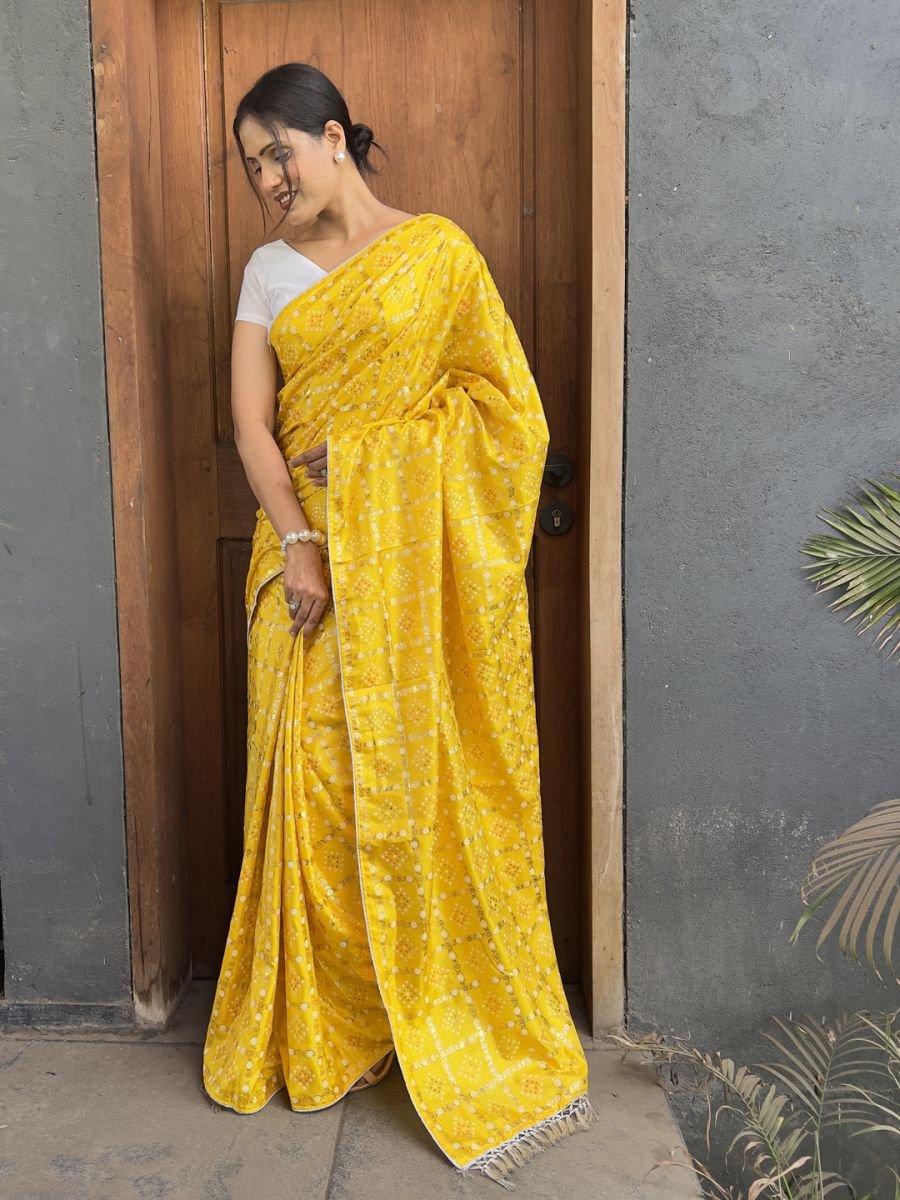 Fabric: Silk Blend Work/Design: Bandhani-inspired floral print Saree Length: 5.5 meters Blouse Piece Length: 0.8 meters (Unstitched) Occasion: Wedding, Festive, Party, Traditional Wear Style: Ethnic, Elegant, Lightweight & Comfortable Care Instructions: Dry Clean or Gentle Hand Wash The vibrant Bandhani-inspired floral prints bring a touch of Rajasthan’s rich heritage, while the soft silk blend fabric ensures comfort for long wear. Whether it’s a festive celebration, wedding function, or party, this saree makes you stand out effortlessly.