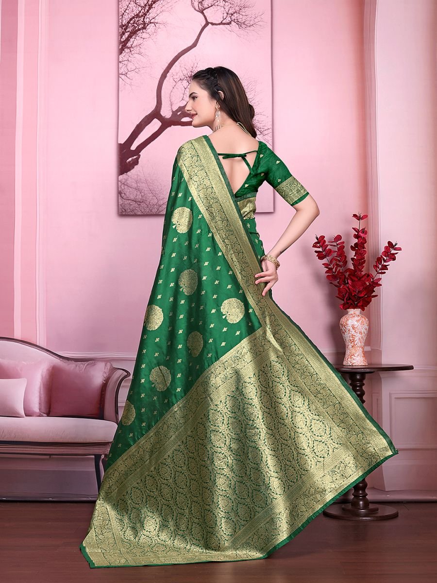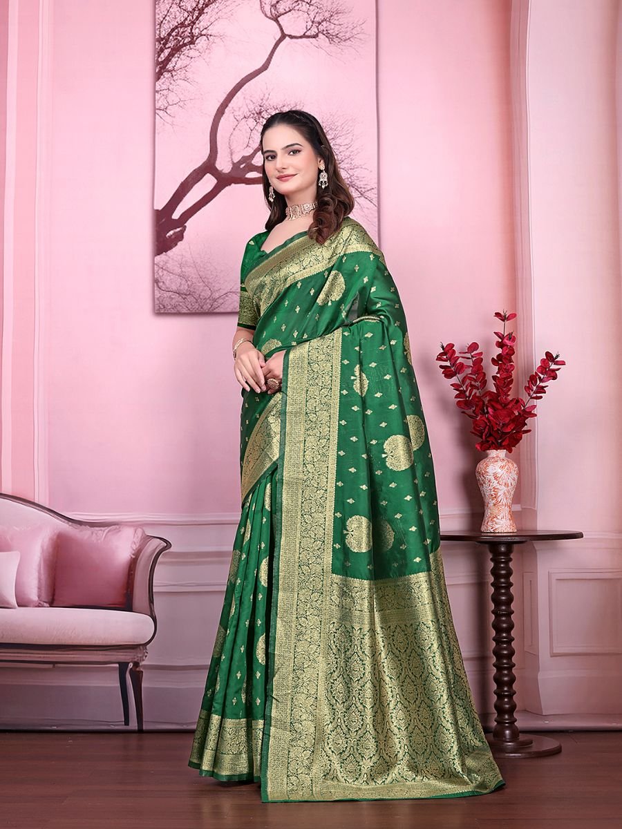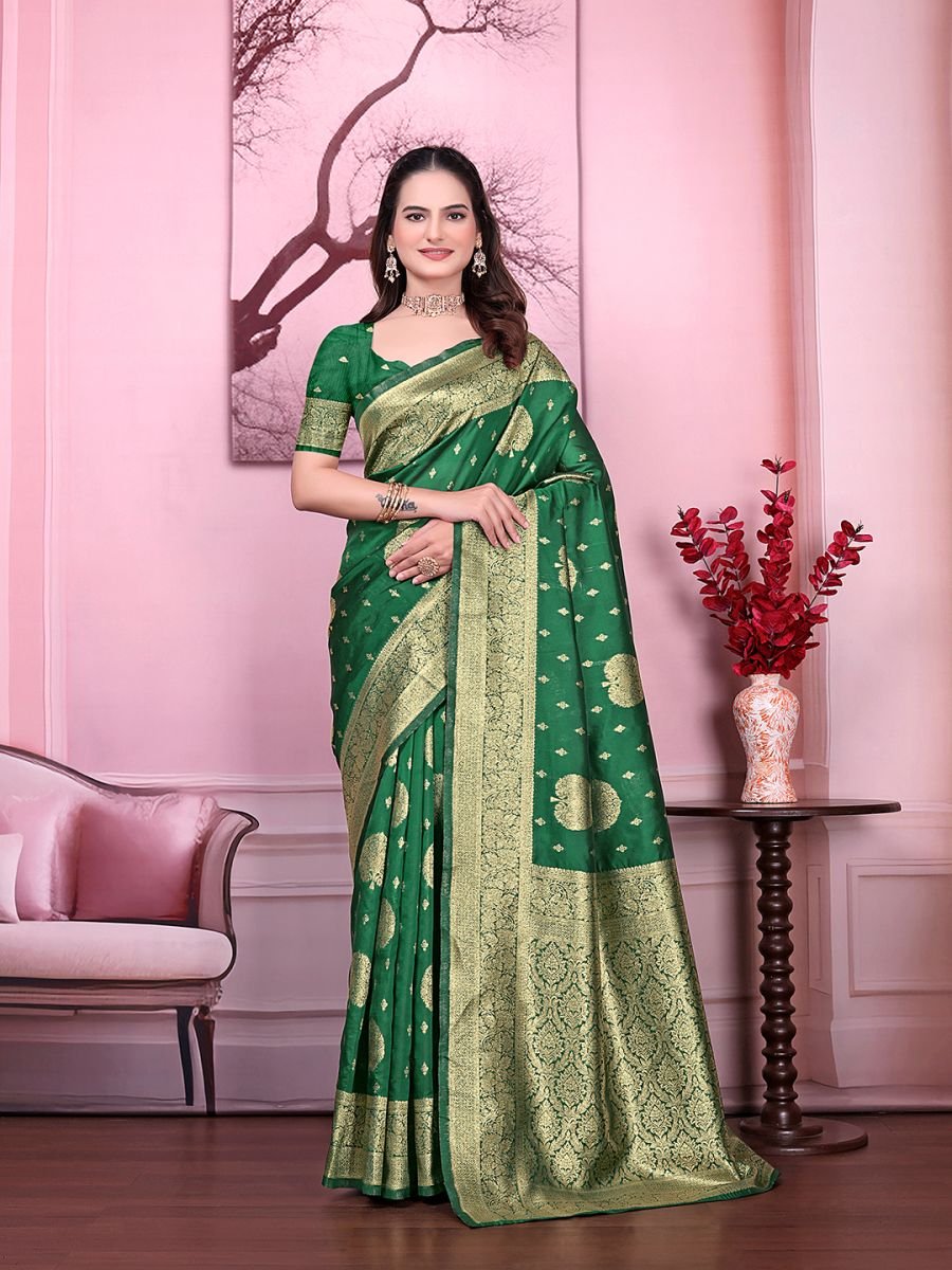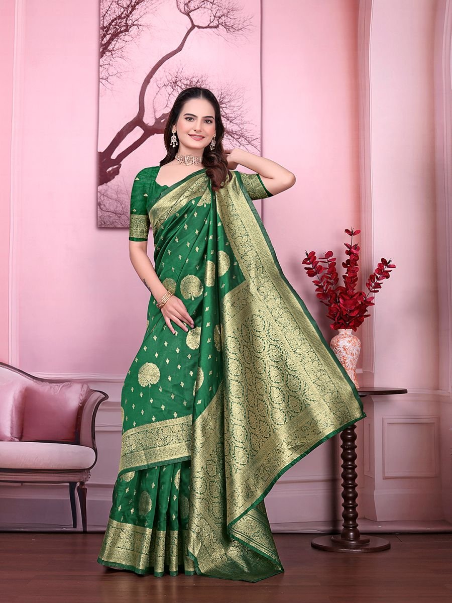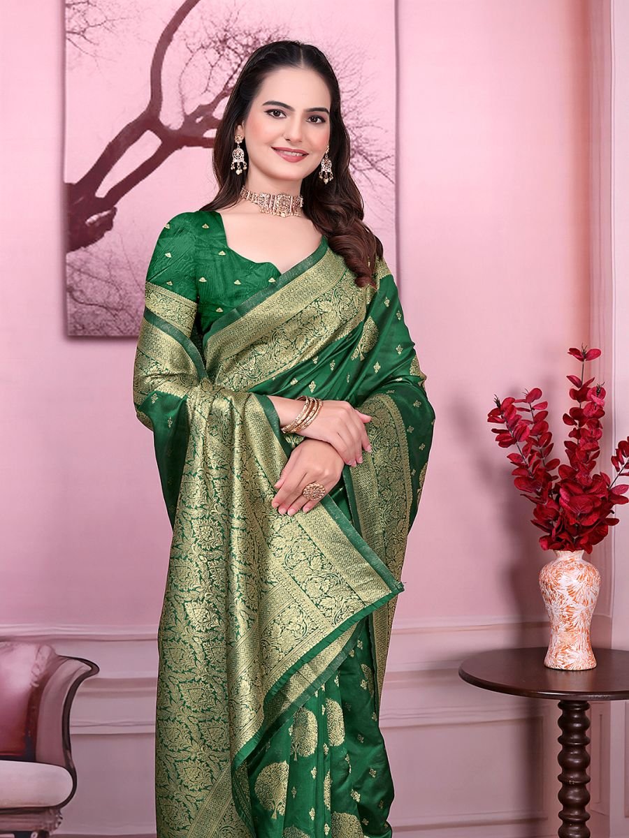 Fabric: Banarasi Jacquard Work/Design: Woven Floral Print Saree Length: 5.5 Meters Blouse Length: 0.8 Meter (Unstitched) Style: Party Wear / Festive Wear Occasion: Weddings, Receptions, Traditional Functions, Parties Blouse Type: Contrast/Matching unstitched blouse piece included Care Instruction: Dry clean recommended for long-lasting shine Step into timeless elegance with this Banarasi Jacquard Floral Print Saree, designed to make every occasion special. Crafted from rich jacquard fabric, the saree features intricate floral patterns that exude a traditional yet stylish charm. Its smooth drape and glossy finish add a royal touch, making it perfect for weddings, receptions, festive gatherings, and parties.