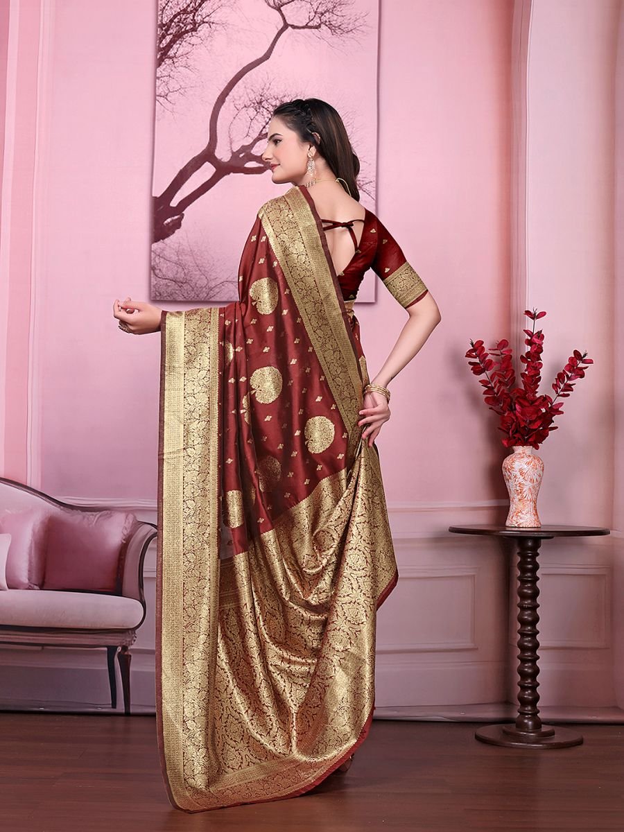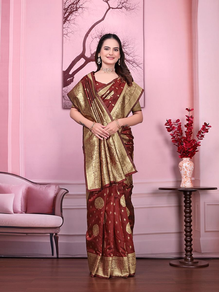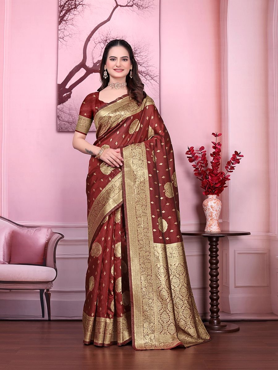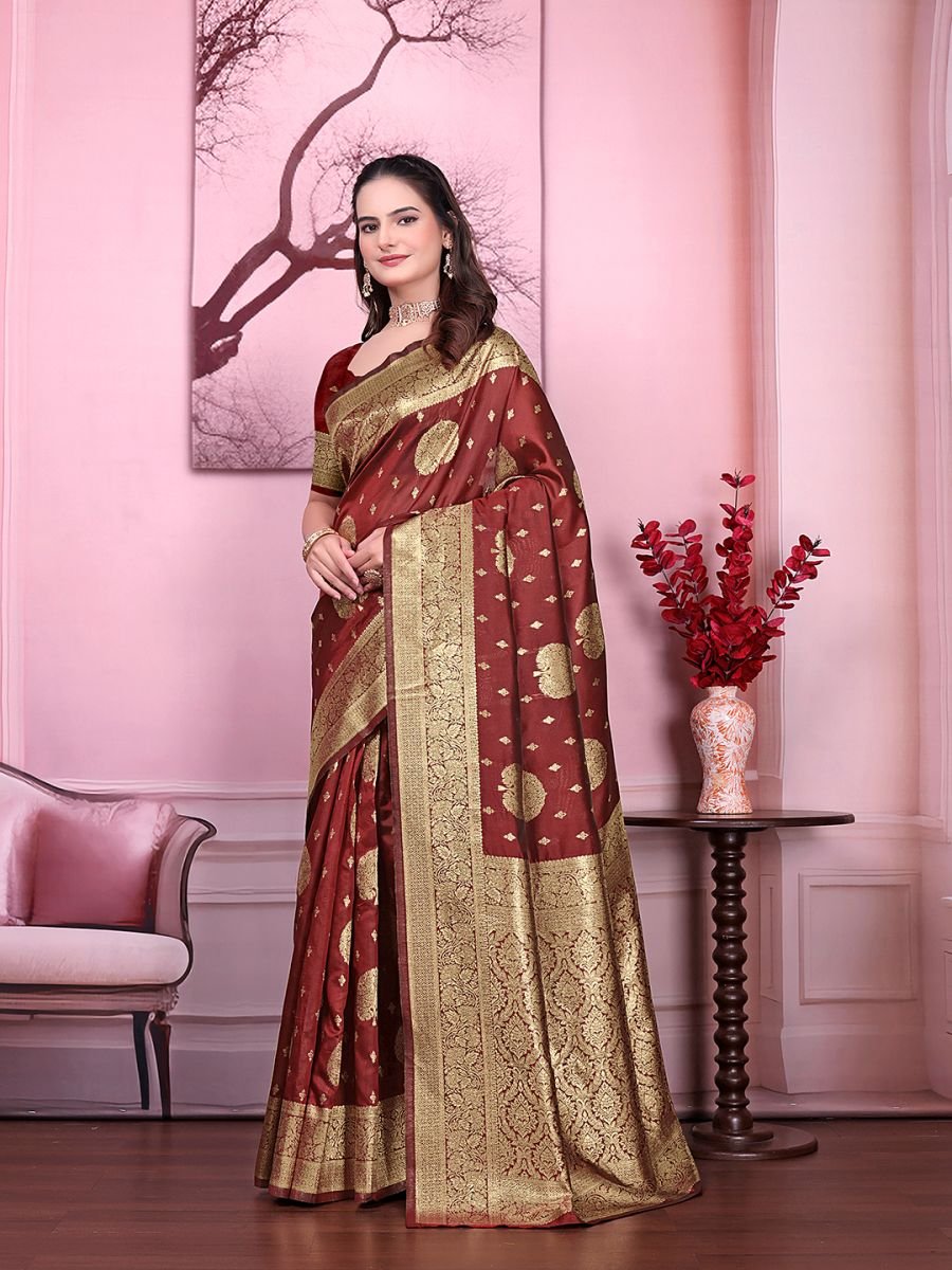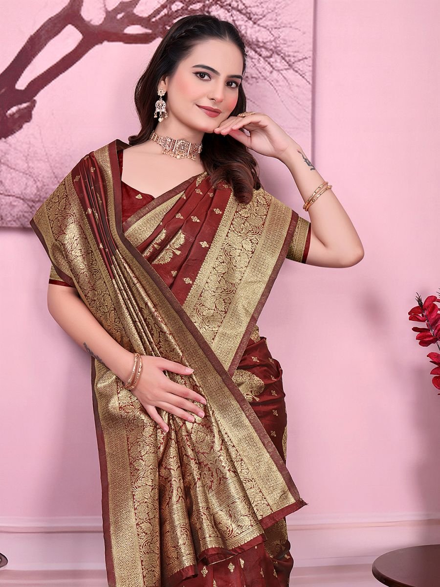 Fabric: Banarasi Jacquard Work/Design: Woven Floral Print Saree Length: 5.5 Meters Blouse Length: 0.8 Meter (Unstitched) Style: Party Wear / Festive Wear Occasion: Weddings, Receptions, Traditional Functions, Parties Blouse Type: Contrast/Matching unstitched blouse piece included Care Instruction: Dry clean recommended for long-lasting shine Step into timeless elegance with this Banarasi Jacquard Floral Print Saree, designed to make every occasion special. Crafted from rich jacquard fabric, the saree features intricate floral patterns that exude a traditional yet stylish charm. Its smooth drape and glossy finish add a royal touch, making it perfect for weddings, receptions, festive gatherings, and parties.