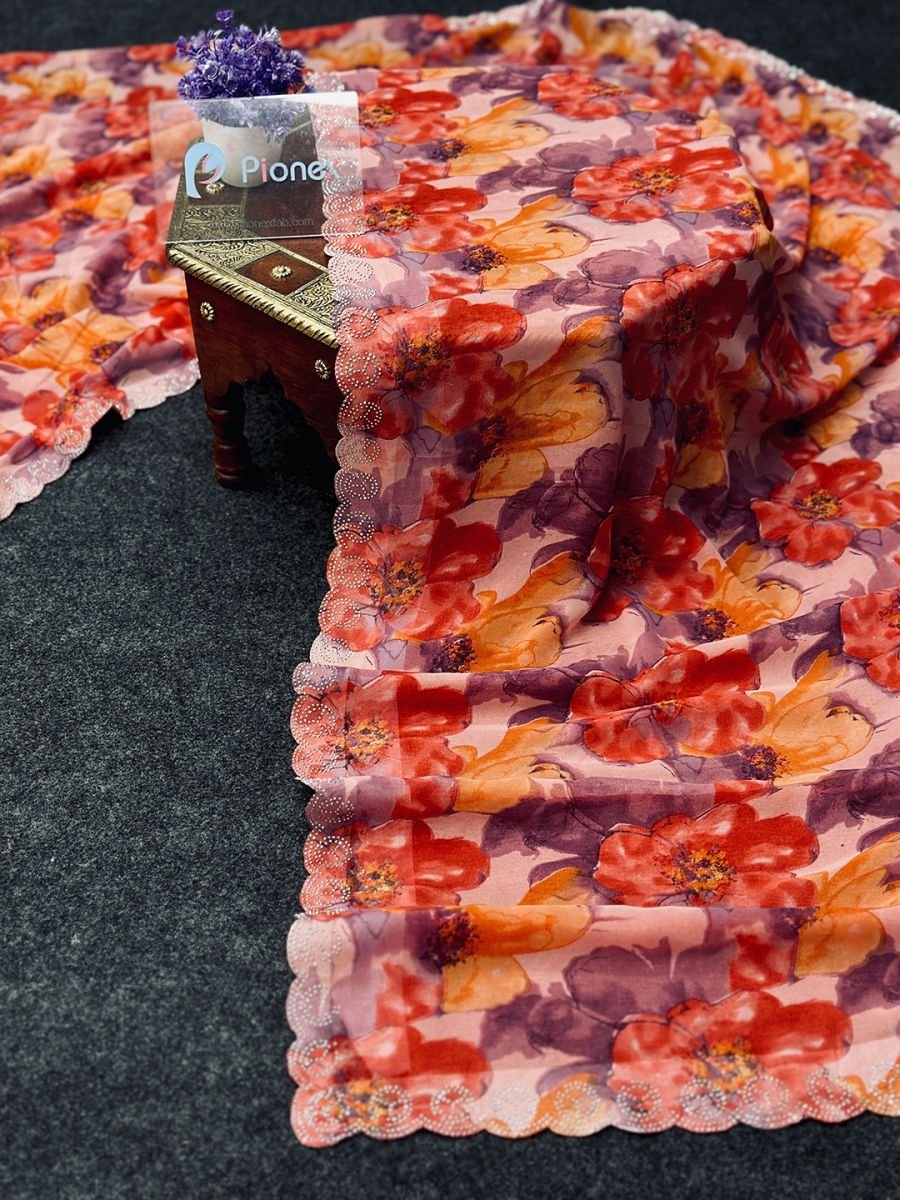 Fabric: Georgette | Design: Floral printed pattern | Saree Length: 5.5 meters | Blouse Piece Length: 0.8 meters (unstitched) | Occasion: Party, Wedding, Festive, Casual, Office Wear | Wash Care: Gentle hand wash or dry clean recommended | Lightweight & flowy georgette fabric for easy draping | Elegant floral prints that never go out of style | Comes with a matching unstitched blouse piece | Suitable for multiple occasions | Add a touch of elegance to your ethnic wardrobe with this Georgette Floral Print Saree featuring a shimmering Swarovski work border. Crafted from soft and lightweight georgette, this saree offers a graceful drape. The intricate border adds a luxurious touch, perfect for festive occasions, parties, or weddings. Comes with a matching unstitched blouse piece to customize looks.