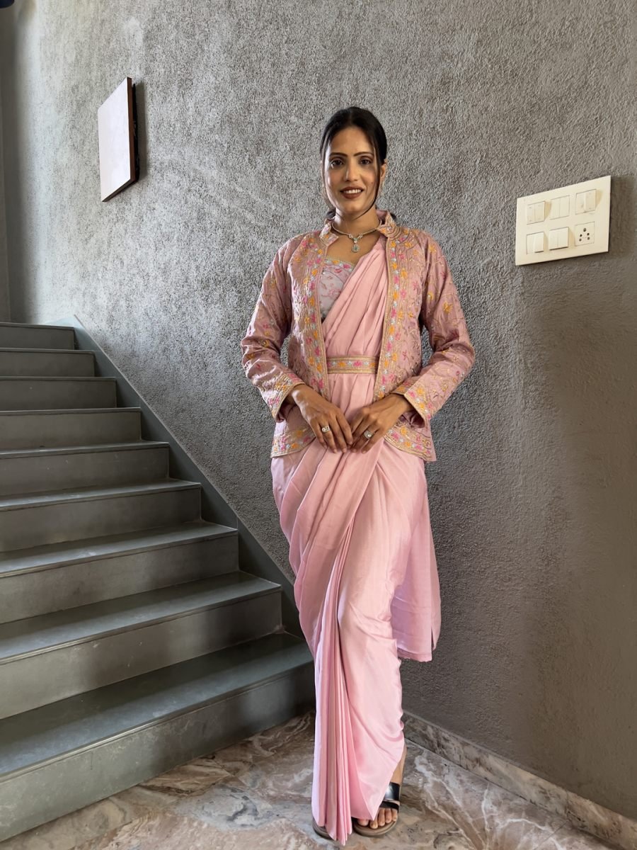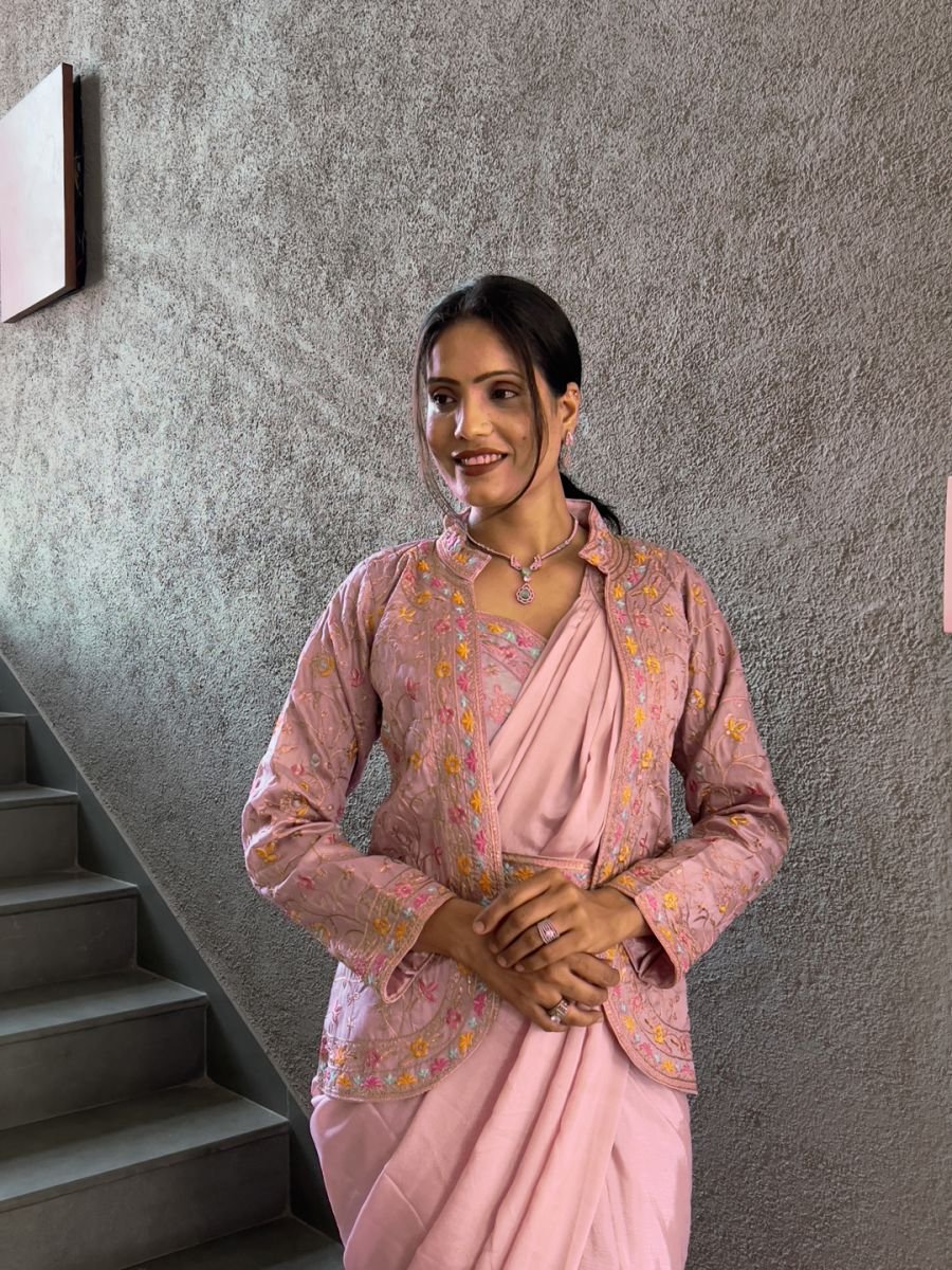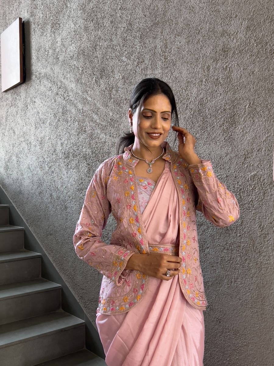 Heavy Chinon Jacket Saree With Blouse and Cording Embroidered Work