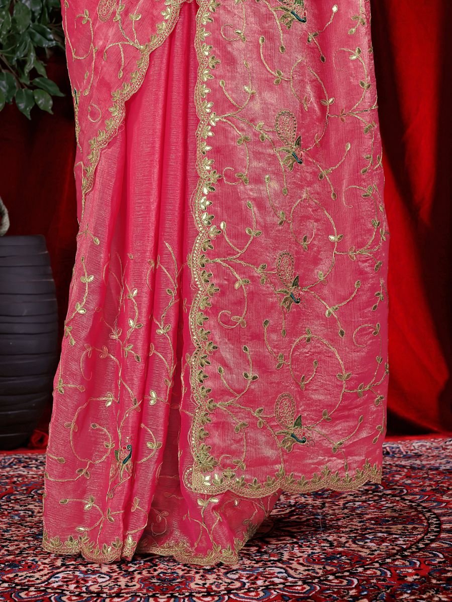 Intricately adorned with handcrafted Gotta Patti embroidery and delicate peacock motifs, this saree exudes grace and refinement. The rich embroidered border and fine thread detailing across the body enhance its visual appeal. A matching blouse piece with coordinated embroidery completes the look, making it a perfect choice for celebrations, family gatherings, and festive events.