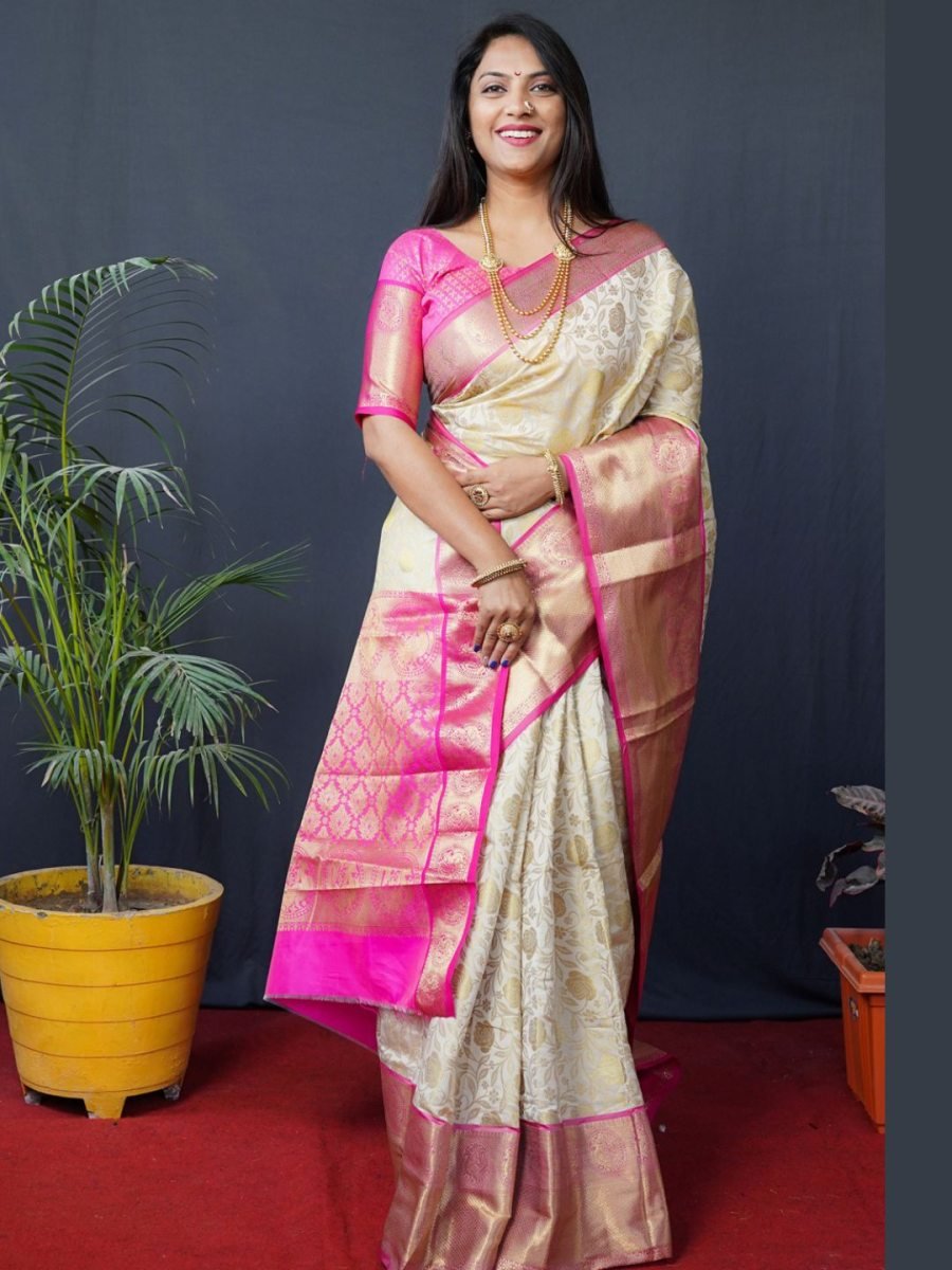 Fabric: Premium Kanjivaram Silk Design: Rich woven pallu with traditional patterns Saree Length: 5.5 meters Blouse Length: 0.8 meters (Unstitched) Occasion: Wedding, Party, Festive, Traditional, Cultural Events Style: Classic Indian Ethnic Wear Care Instructions: Dry clean recommended for longevity The saree comes with a 5.5-meter length ensuring a perfect drape, and an 0.8-meter unstitched blouse piece for a customized fit. Designed to reflect sophistication, the rich woven pallu enhances the overall grandeur, while the smooth silk body ensures comfort throughout the day.