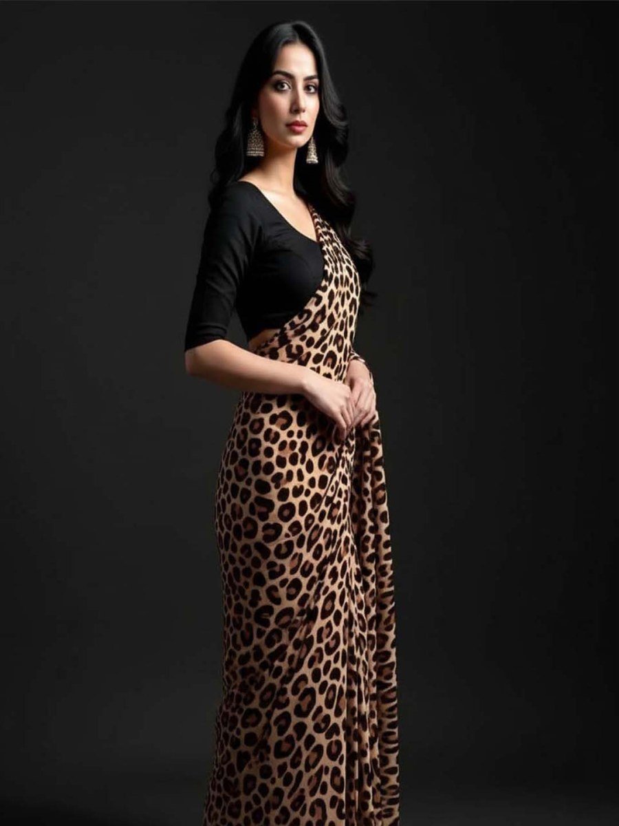 Leopard Print Silk Crepe Saree with Contrast Black Blouse Piece