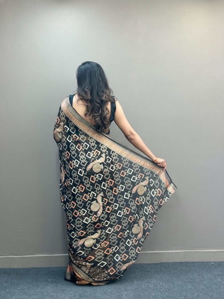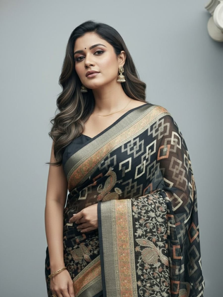 Key Features Fabric: Premium Brasso Chiffon Design: Combination of geometric motifs and floral woven patterns Color Theme: Black base with gold, bronze, and earthy highlights Border: Broad ornate weaving with intricate detailing Texture: Lightweight, soft drape with a semi-transparent brasso effect Occasion: Perfect for weddings, receptions, festive events, parties & ethnic celebrations Step into a world of sheer sophistication with our Premium Brasso Chiffon Saree. Famous for its unique "burnout" texture, this lightweight drape features translucent sheer backgrounds contrasted with intricate woven motifs that appear to float on the fabric. Soft, flowy, and effortlessly glamorous, it is the perfect choice for daytime soirees and elegant evening dinners.