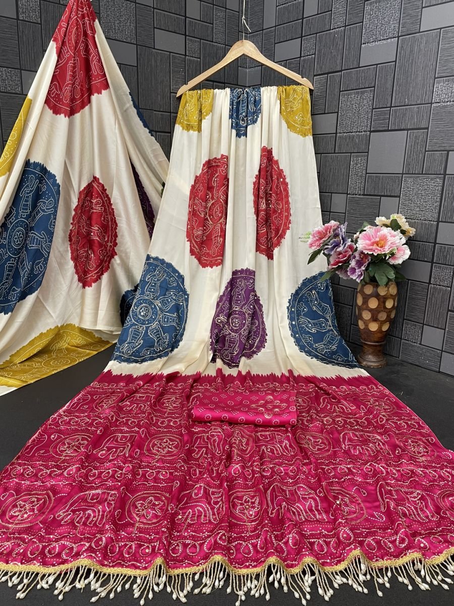 Key Features Superior Fabric: Crafted from premium Satin Silk with a soft, luxurious sheen. Traditional Artistry: Features classic Bandhani-style circular motif prints in vibrant hues. Exquisite Detailing: A heavy contrast border accented with trendy tassel lace. Comfort First: Smooth, lightweight material that provides an easy and comfortable drape for long hours. Complete Set: Includes a matching unstitched blouse piece to customize your look.