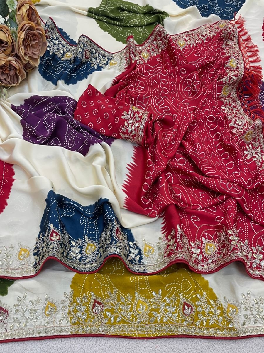 Premium Satin Silk Celebration Saree Intricate Embroidery Bandhani Moti