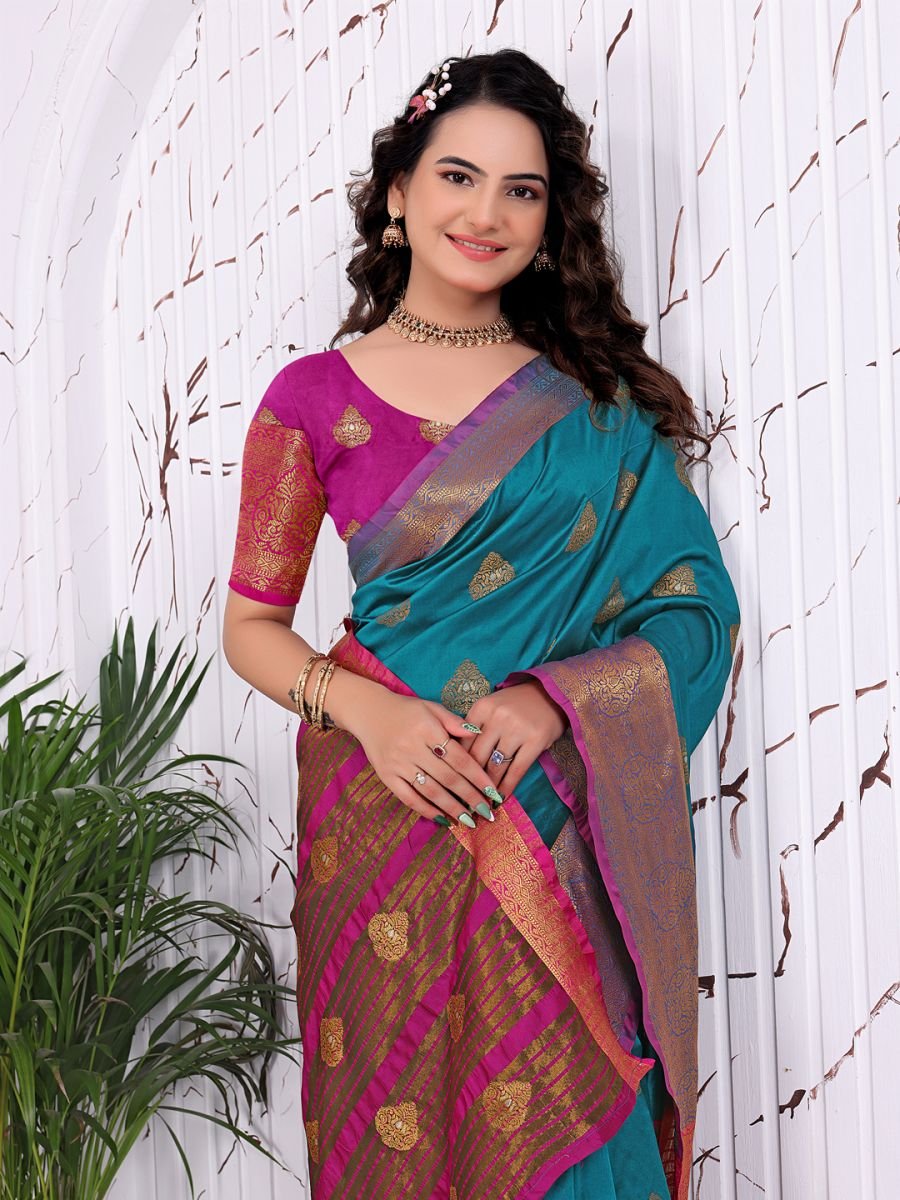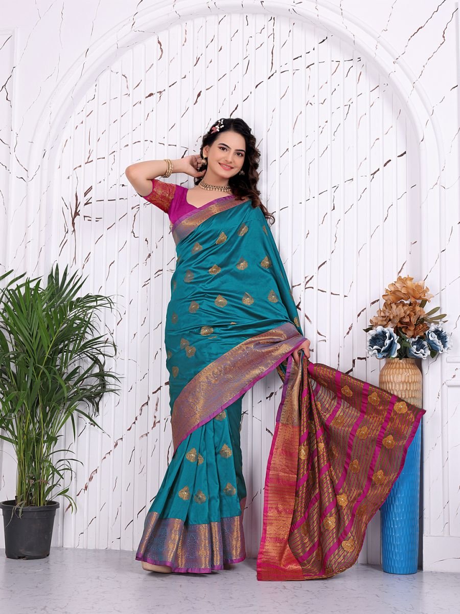 Fabric: 100% Pure Banarasi Silk, offering a premium shine, soft texture, and durable quality. Workmanship: Features intricate Jacquard weaving and traditional woven motifs throughout the body and pallu. Style: Ready-to-wear/one-minute saree concept with pre-sewn pleats for a hassle-free experience. Fit & Comfort: Designed with a convenient waist closure system (hooks/elastic) to ensure a secure and comfortable fit for various waist sizes. Blouse: Includes a coordinating unstitched blouse piece with matching woven borders. Occasion: Perfect for weddings, receptions, festivals, and cultural events. Care Instructions: Professional dry clean only to maintain the integrity of the silk and weaving. Ready-to-Wear Banarasi Silk Saree. Crafted for the modern woman who cherishes heritage but values time, this saree eliminates the hassle of pleating and draping. Made from Pure Banarasi Silk, the fabric offers a lustrous sheen and a fluid drape that feels regal against the skin. The body of the saree is adorned with sophisticated Jacquard and woven weaving work, creating a rich texture and an opulent aesthetic suitable for the grandest occasions.