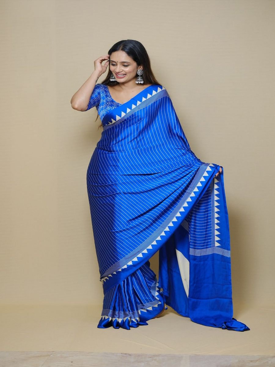 Fabric: Premium Quality Crepe Silk (Soft, fluid, and lightweight with a subtle sheen). Pattern: Vertical Pinstripes (Body) for a slimming visual effect. Border Style: Distinctive White Temple (Sawtooth) Border. Blouse: Comes with a matching blouse piece featuring a contrast white geometric/lattice print. Drape: Heavy, fluid fall that sits perfectly without pleating difficulty. Step into effortless elegance with this stunning Crepe Silk Saree. Known for its buttery-soft texture and superior drape, the premium crepe silk fabric glides over the silhouette, offering a slimming and sophisticated look. The body features modern vertical white pinstripes that add height and structure, perfectly framed by a classic white geometric temple (sawtooth) border. Paired with a contrast geometric print blouse, this saree is the ultimate blend of traditional comfort and modern corporate chic. Perfect for office wear, day events, or elegant evening gatherings.