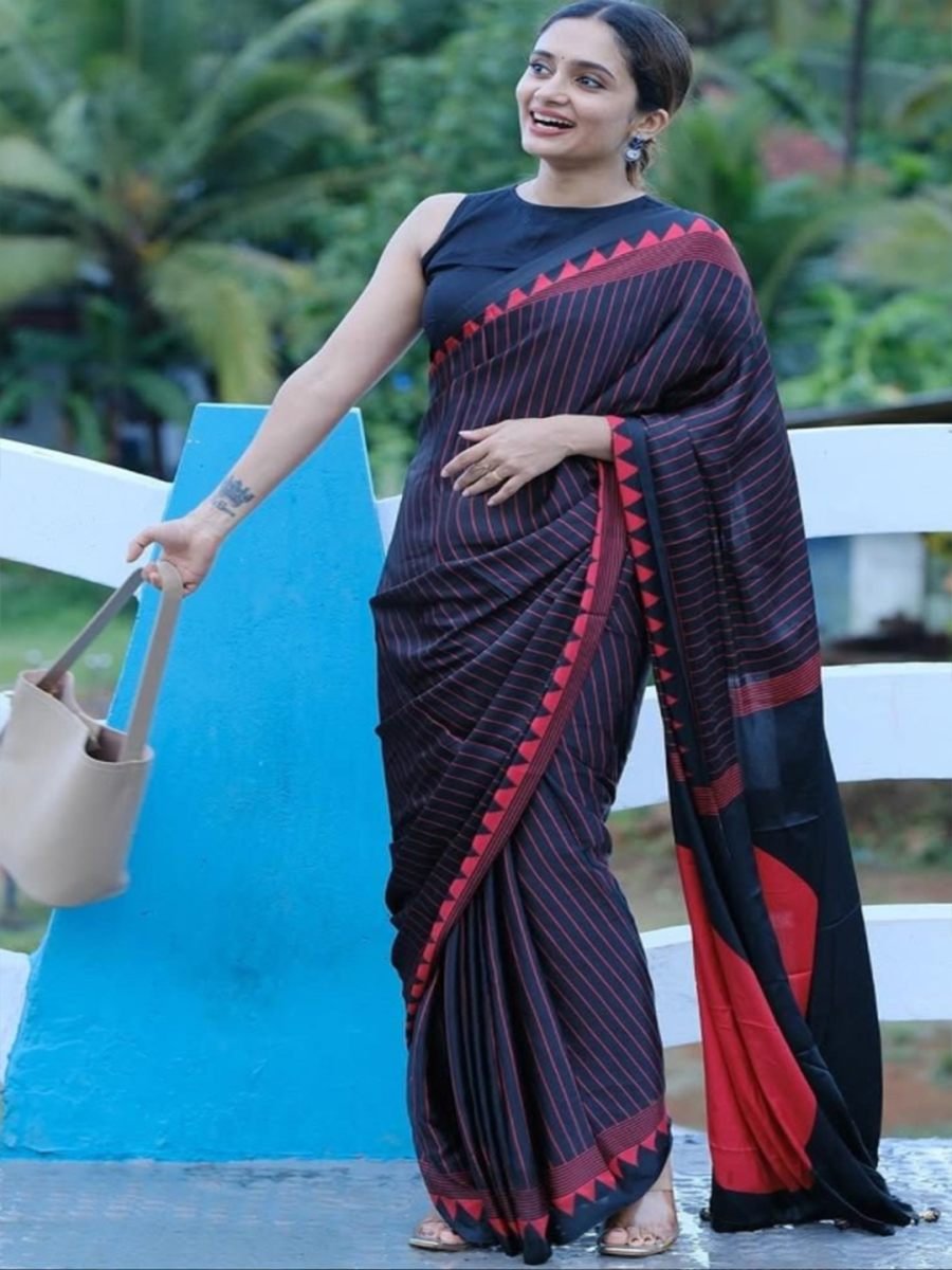 Fabric: Premium Quality Crepe Silk (Soft, fluid, and lightweight with a subtle sheen). Pattern: Vertical Pinstripes (Body) for a slimming visual effect. Border Style: Distinctive White Temple (Sawtooth) Border. Blouse: Comes with a matching blouse piece featuring a contrast white geometric/lattice print. Drape: Heavy, fluid fall that sits perfectly without pleating difficulty. Step into effortless elegance with this stunning Crepe Silk Saree. Known for its buttery-soft texture and superior drape, the premium crepe silk fabric glides over the silhouette, offering a slimming and sophisticated look. The body features modern vertical white pinstripes that add height and structure, perfectly framed by a classic white geometric temple (sawtooth) border. Paired with a contrast geometric print blouse, this saree is the ultimate blend of traditional comfort and modern corporate chic. Perfect for office wear, day events, or elegant evening gatherings.
