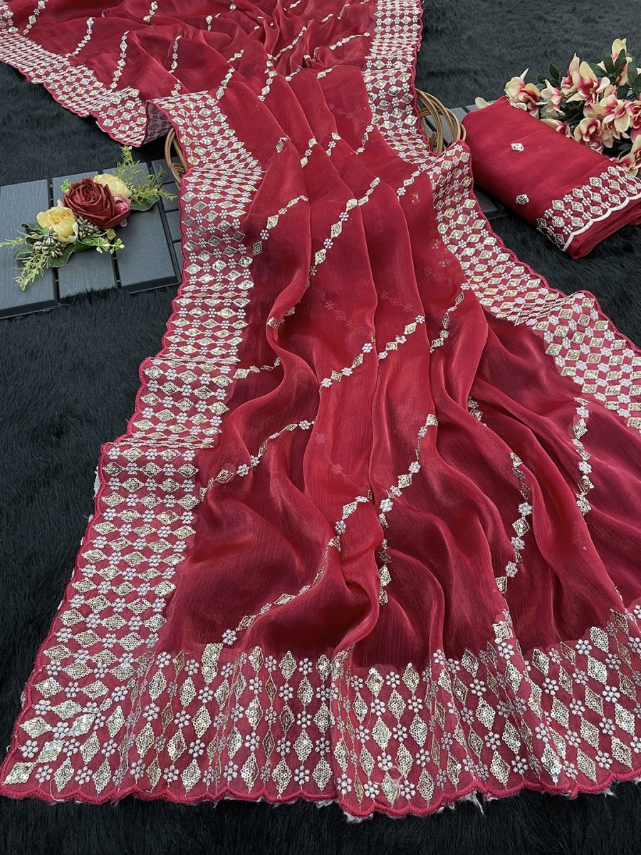 Introducing our Exquisite Organza Saree, adorned with intricate embroidered sequence butti designs and a stunning scalloped border. Crafted from luxurious organza, this saree offers a light, flowing drape that enhances your elegance and grace. The delicate sequence embroidery catches the light beautifully, adding a touch of sparkle to your ensemble. The scalloped border lends a unique and contemporary twist, making it perfect for weddings, festive celebrations, or any special occasion. Pair it with statement earrings and a sleek blouse to complete your look and make a lasting impression. Elevate your style with this captivating saree!
