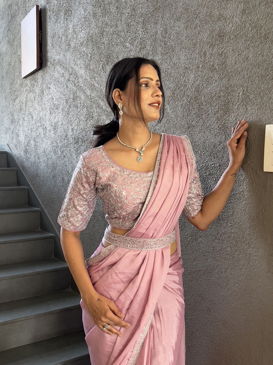 Ready To Wear Chinon Embroidery Work Saree With Stitched Blouse