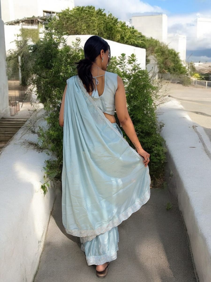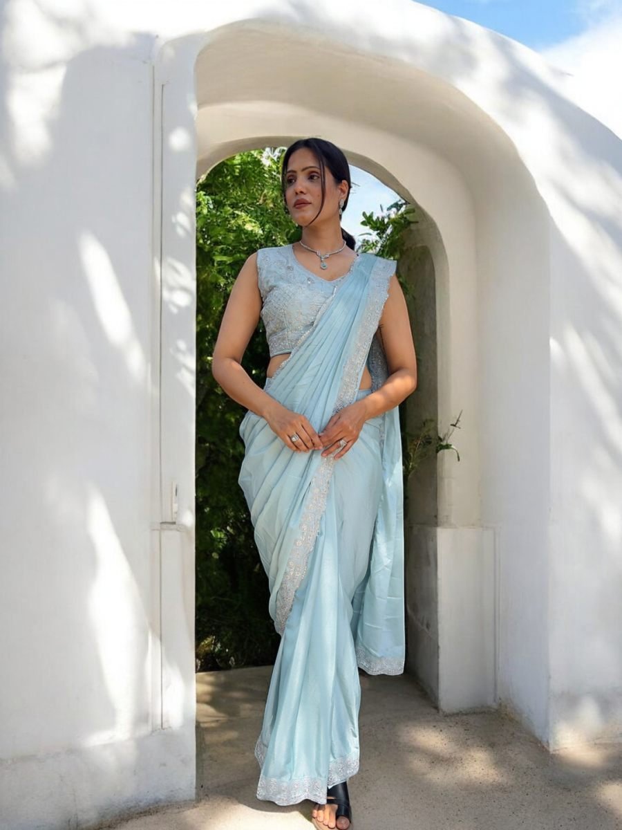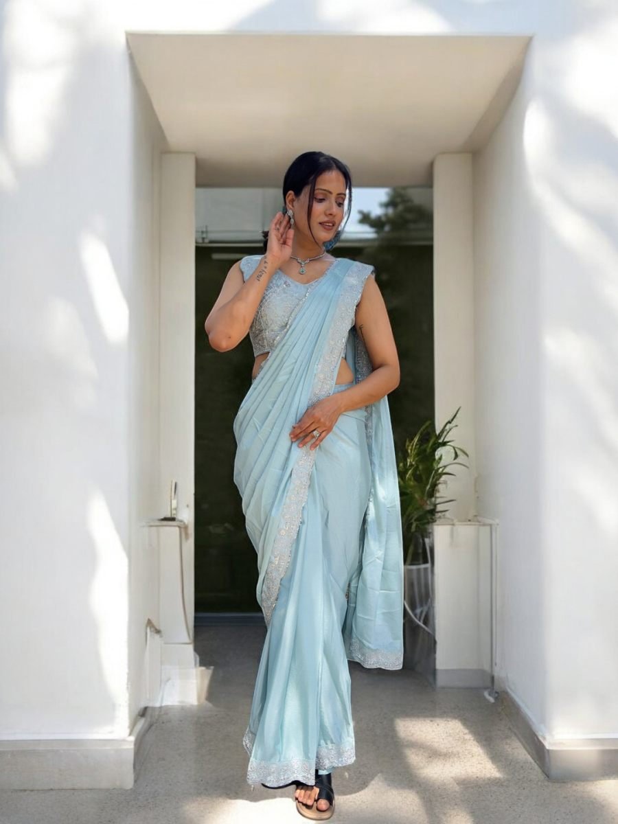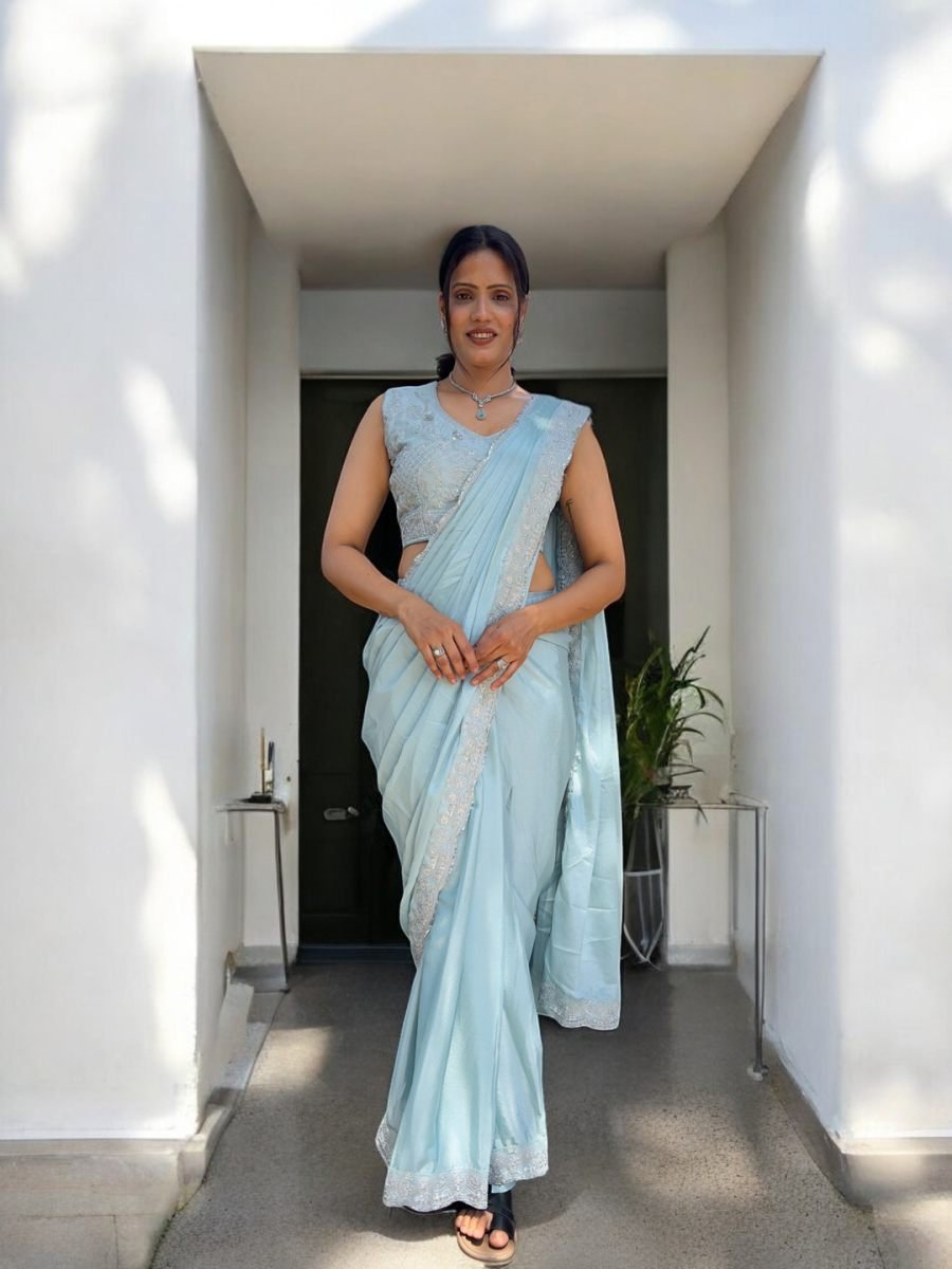 Ready To Wear Chinon Embroidery Work Saree With Stitched Blouse