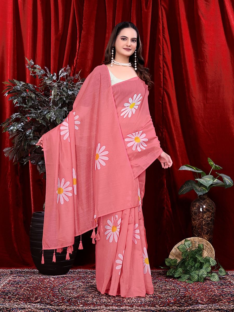 Fabric: Pure Linen Handloom Design: Floral Print Saree Length: 5.5 meters (Ready to wear) Blouse Piece: 0.8 meters (Unstitched) Lightweight, breathable & skin-friendly Ideal for festive wear, office wear, and casual occasions Easy to drape & comfortable for all-day wear The saree comes with a 5.5-meter length for graceful pre-draping and includes an unstitched blouse piece of 0.8 meters, giving you the freedom to style it as per your choice. Pure cotton fabric adds a natural shine, easy drape, and superior comfort, making this saree a must-have in your ethnic wardrobe. Pair it with traditional jewelry and elegant footwear to complete the look.