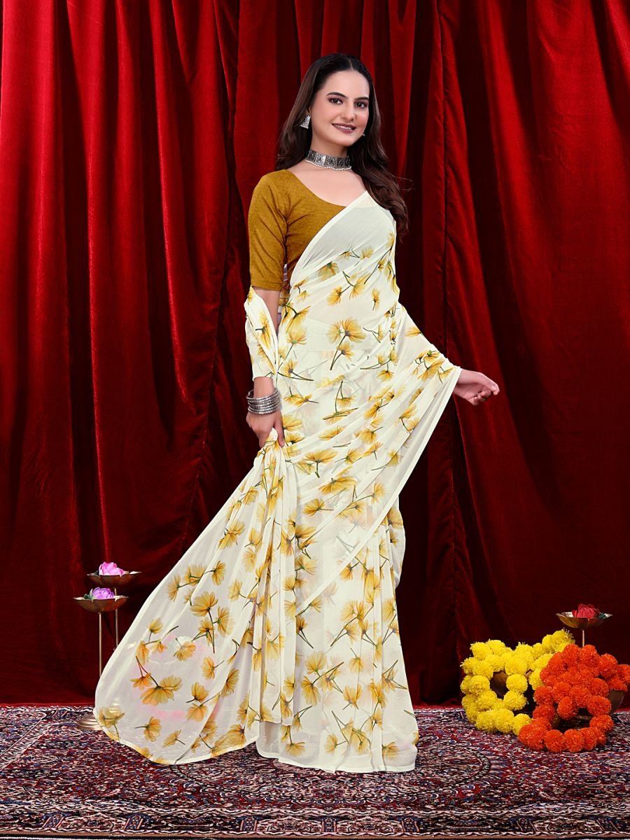 Fabric: Georgette Work: Floral Printed Saree Type: Ready to Wear / Pre-Stitched Easy One-Minute Drape Saree Length: 5.5 meters (approx.) Blouse Piece Length: 0.8 meters (unstitched) Occasion: Festive, Party, Office, and Casual Wear Pattern: Lightweight & Comfortable Drape Step into effortless elegance with this ready-to-wear georgette printed saree, designed for today’s modern woman who values both tradition and convenience. Crafted from lightweight georgette fabric, this saree is pre-stitched for easy draping—no pleating, no tucking, just slip it on and you’re ready in one minute. The floral printed design adds a refreshing charm, making it an ideal pick for festive occasions, parties, office wear, or casual gatherings.