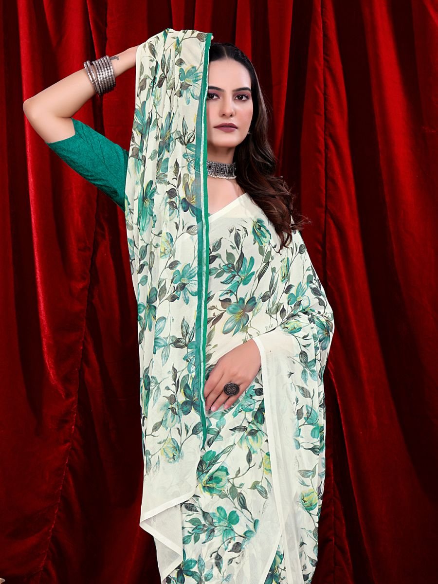 Fabric: Georgette Work: Floral Printed Saree Type: Ready to Wear / Pre-Stitched Easy One-Minute Drape Saree Length: 5.5 meters (approx.) Blouse Piece Length: 0.8 meters (unstitched) Occasion: Festive, Party, Office, and Casual Wear Pattern: Lightweight & Comfortable Drape Step into effortless elegance with this ready-to-wear georgette printed saree, designed for today’s modern woman who values both tradition and convenience. Crafted from lightweight georgette fabric, this saree is pre-stitched for easy draping—no pleating, no tucking, just slip it on and you’re ready in one minute. The floral printed design adds a refreshing charm, making it an ideal pick for festive occasions, parties, office wear, or casual gatherings.