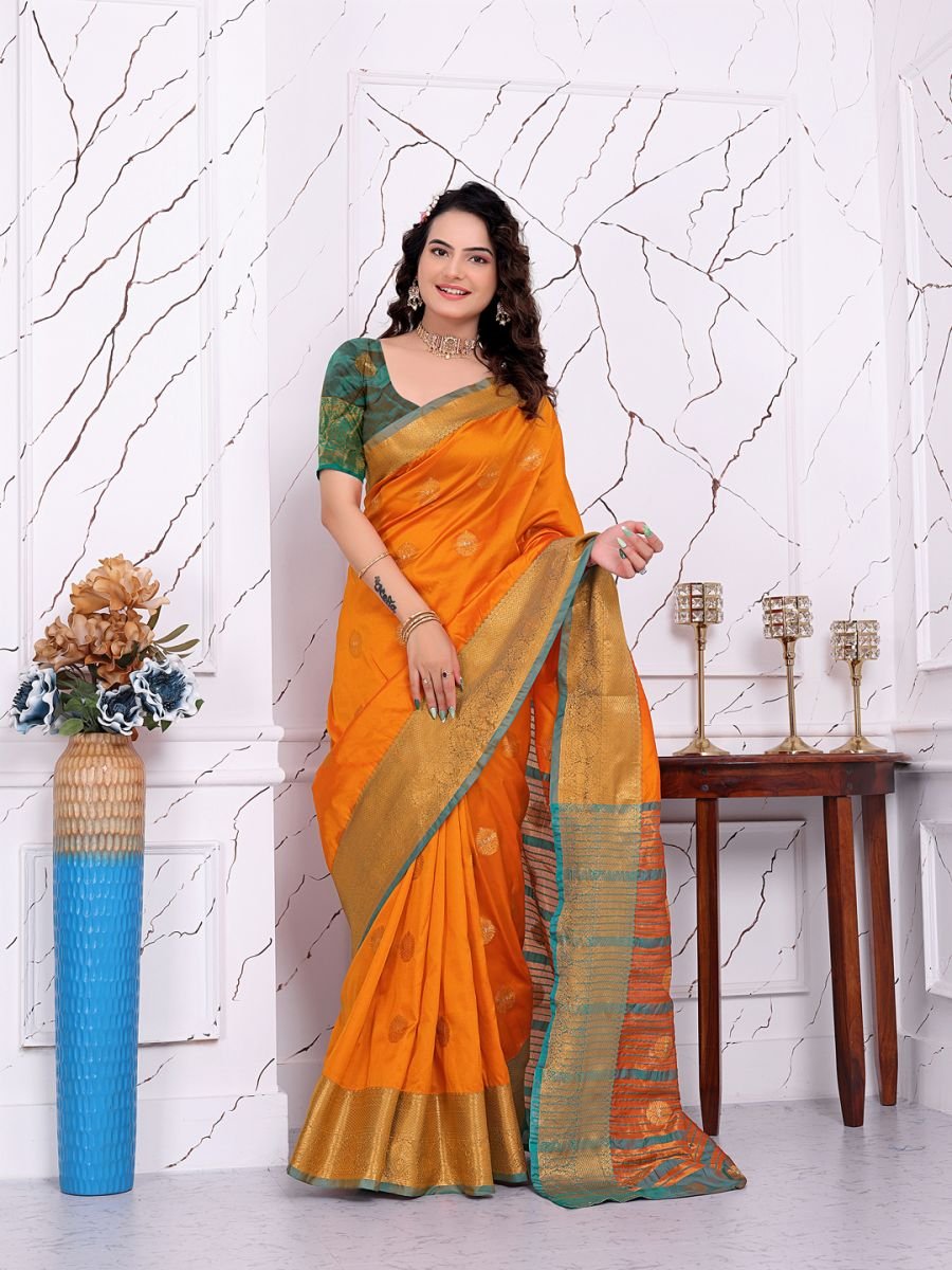 Fabric: 100% Pure Banarasi Silk, offering a premium shine, soft texture, and durable quality. Workmanship: Features intricate Jacquard weaving and traditional woven motifs throughout the body and pallu. Style: Ready-to-wear/one-minute saree concept with pre-sewn pleats for a hassle-free experience. Fit & Comfort: Designed with a convenient waist closure system (hooks/elastic) to ensure a secure and comfortable fit for various waist sizes. Blouse: Includes a coordinating unstitched blouse piece with matching woven borders. Occasion: Perfect for weddings, receptions, festivals, and cultural events. Care Instructions: Professional dry clean only to maintain the integrity of the silk and weaving. Ready-to-Wear Banarasi Silk Saree. Crafted for the modern woman who cherishes heritage but values time, this saree eliminates the hassle of pleating and draping. Made from pure Banarasi silk, the fabric offers a lustrous sheen and a fluid drape that feels regal against the skin. The body of the saree is adorned with sophisticated Jacquard and woven weaving work, creating a rich texture and an opulent aesthetic suitable for the grandest occasions.