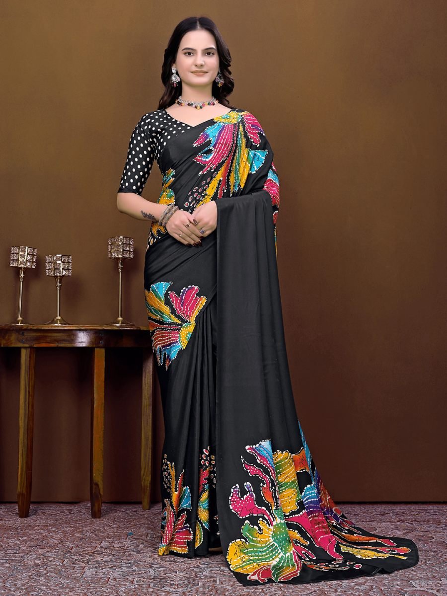 Key Features: • Fabric: Premium Silk Crepe Saree • Design: Artistic Batik Floral Print on Pallu • Style: Ready To Wear / One Minute Saree • Blouse: Polka Dot Printed Unstitched Blouse Piece • Waist Size: Adjustable from 26" to 54" Inch • Saree Height (Width): 39 Inch • Comfort Fit: Pre-stitched pleats for easy draping • Occasion: Festive, Party Wear, Wedding Functions, Ethnic Events • Lightweight & Flowing Fabric: Comfortable for long wear Product Description: Ready To Wear Silk Crepe Saree designed for effortless style and comfort. This one-minute saree features a smooth and flowy silk crepe fabric that drapes beautifully and gives a graceful silhouette. The saree showcases vibrant batik floral prints on the pallu, adding a modern artistic touch to the classic saree look. It comes with a stylish polka dot patterned blouse piece (unstitched) that perfectly complements the saree design. The pre-stitched pleats make it extremely easy to wear, making it ideal for parties, festive occasions, and special gatherings. With its adjustable waist design, this saree ensures a comfortable fit while maintaining a chic and fashionable appearance.