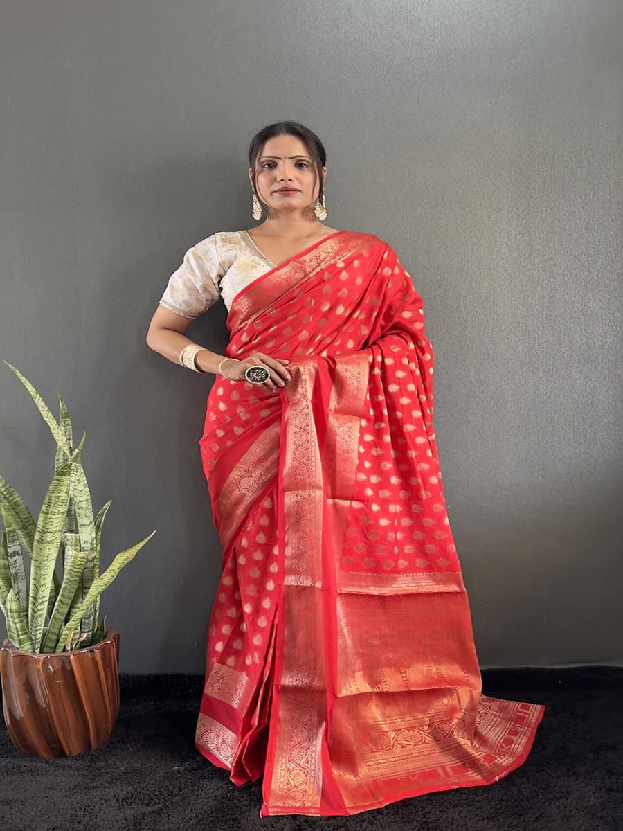 Beautiful Ready-to-Wear Saree with Pure Banarasi Georgette with a Designer Blouse This Is Fully Stitched This beautiful saree, made of fine Banarasi georgette for an opulent drape, blends tradition and contemporary design. The fully stitched blouse offers a perfect fit and hassle-free wear, while the delicate weaving adds timeless appeal. This saree exhibits unmatched elegance and craftsmanship, ideal for weddings, parties, or seasonal festivities. Draw attention to this beautiful outfit that blends elegance, comfort, and appeal.