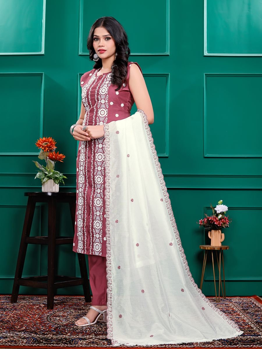 Kurta: Stitched Kurta Fabric: Roman Silk Inner Lining: Cotton Kurta Work: Embroidered Pant: Stitched Pant Fabric: Roman Silk Dupatta: Stitched Dupatta Fabric: Georgette Dupatta Work: Embroidered Dupatta Length: 2.25 meters Sizes Available: M, L, XL Occasion: Party wear, Festive wear, Wedding wear, Ethnic gatherings Fit Type: Regular fit The matching Roman Silk pant offers a stylish and comfortable fit, while the georgette dupatta with embroidered detailing enhances the outfit with a graceful finishing touch. Perfect for festive celebrations, wedding functions, parties, and cultural events, this ensemble ensures you look radiant on every occasion.