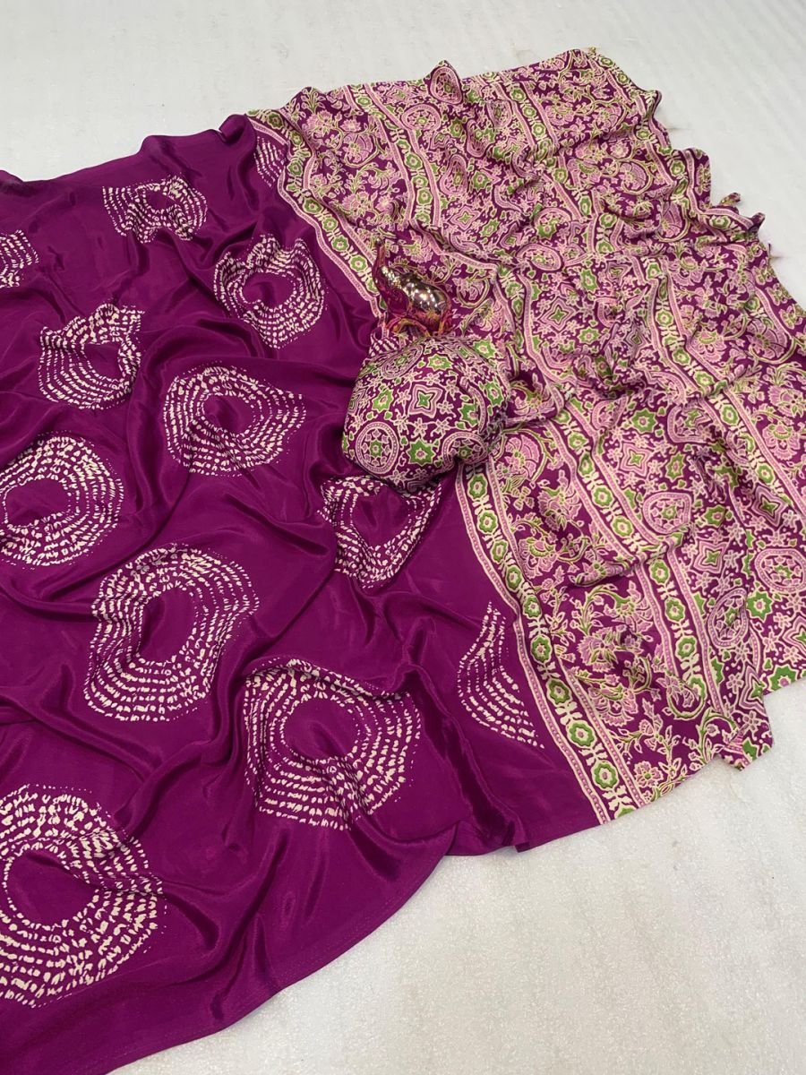 Fabric: Satin Silk Print: Ajrakh-Inspired Print & Circular Pallu Design Saree Length: 5.5 meters Blouse Piece: 0.8 meters (Unstitched) Work: Printed Design Occasion: Party, Festive, Traditional Wear The Art of Ajrakh, Reimagined The body of the saree is adorned with intricate prints inspired by the ancient art of Ajrakh. These geometric and floral motifs, rendered in a classic, earthy palette, pay homage to a rich cultural heritage. The modern printing technique ensures sharp details and vibrant, lasting color on the silken canvas. A Symphony of Heritage and Modern Design Experience the perfect blend of tradition and contemporary artistry with our Satin Silk Saree. Crafted from luxuriously smooth and fluid satin silk, this saree drapes like a dream, offering both supreme comfort and an opulent sheen that catches the light with every movement