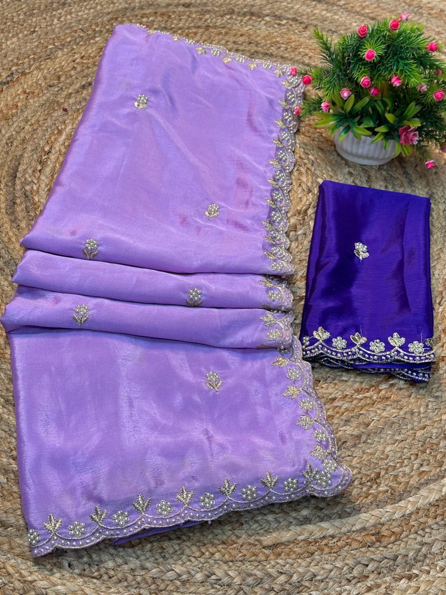 Silk Chinon Embroidered Saree with Thread Moti Work Unstitched Blouse Piece Elegant Designer Saree