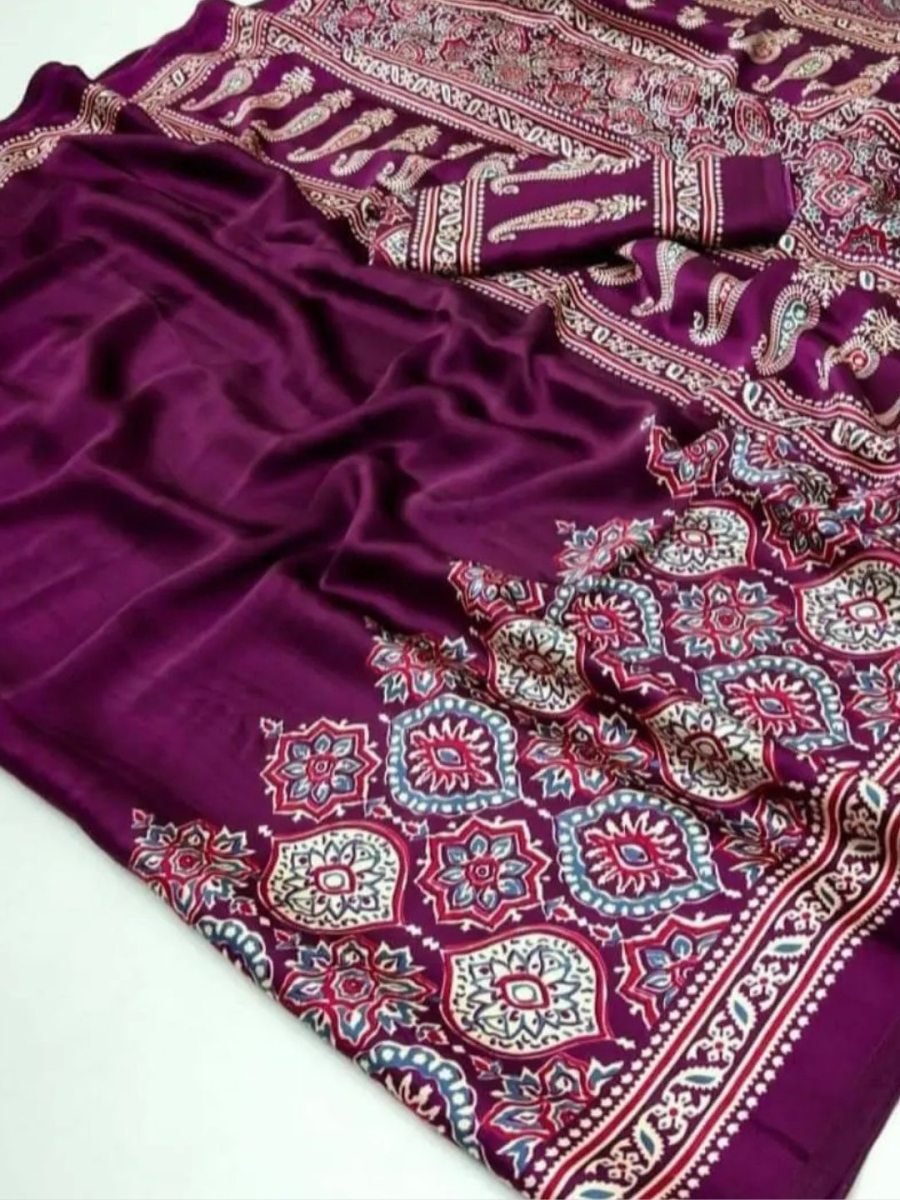 Fabric: Soft Modal Silk – lightweight, breathable, and lustrous | Design: Traditional Ajrakh print with intricate motifs | Saree Length: 5.5 meters | Blouse Piece: 0.8 meters unstitched | Style: Perfect for weddings, festivals, parties, or casual elegance | Care Instructions: Dry clean recommended for lasting beauty. | Elevate your ethnic wardrobe with this exquisite Soft Modal Silk Ajrakh Printed Saree, a perfect blend of tradition, artistry, and comfort. Crafted from premium modal silk, this saree offers a luxuriously soft, smooth texture with a natural sheen that drapes beautifully on any body type.