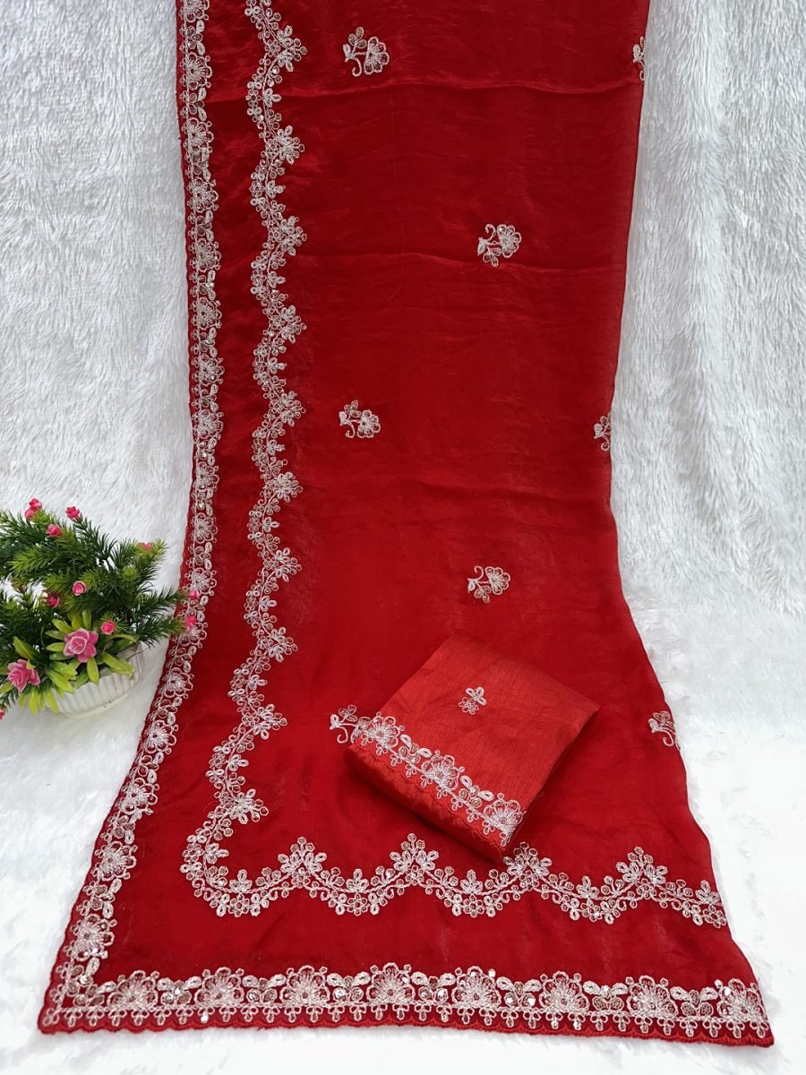 Traditional Embroidered Satin Silk Saree with Unstitched Blouse Piece