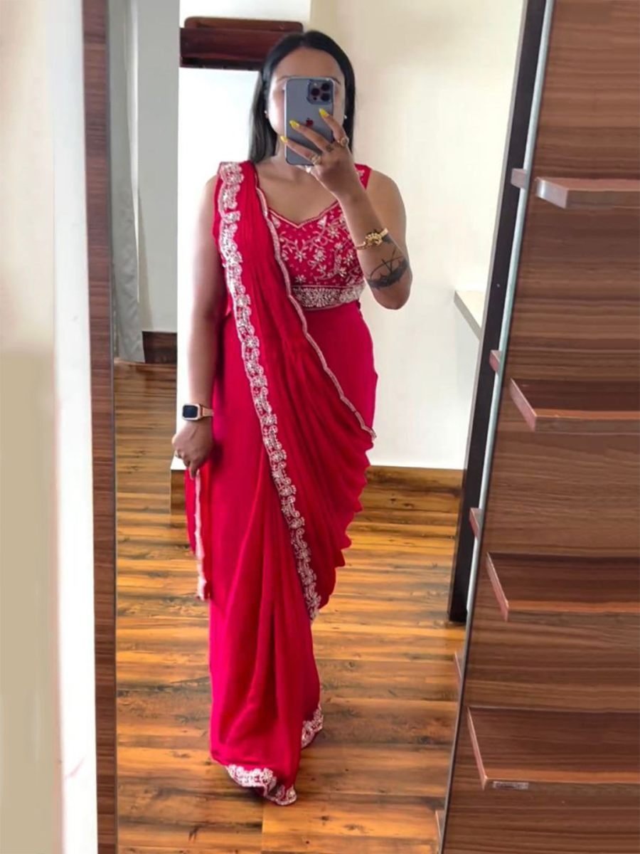 Trending Rani Pink Embroidery cording work ready to wear Saree