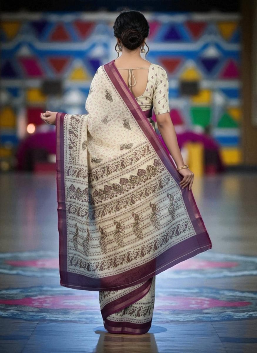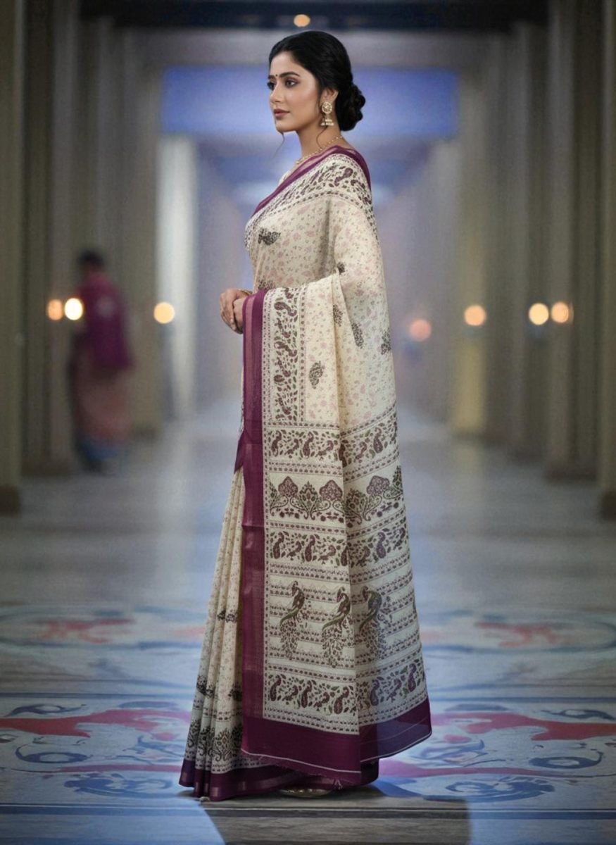 Material: 100% Pure Handloom Cotton Weave Type: Handloom Print Type: High-Resolution All-Over Digital Print Saree Length: 5.5 Meters Blouse Piece: Yes, an attached 0.8-meter blouse piece with a matching print. Weight: Lightweight Feel: Soft, comfortable, and breathable fabric. Easy to drape. Care Instructions: Gentle hand washing in cold water with mild detergent is recommended. Do not bleach or wring. Dry in a shaded area to preserve the colors. Use a warm iron. Occasion: Office Wear, Daily Wear, Casual Outings, Festive Brunches, Small Gatherings. Package Contains: 1 Saree with Attached Blouse Piece. Disclaimer: Product color may slightly vary due to photographic lighting sources or your monitor settings. Minor irregularities are a characteristic of the handloom weaving process and add to the product's charm. Woven by skilled artisans, the pure cotton fabric is the soul of this saree. It is incredibly lightweight, soft against the skin, and exceptionally breathable, making it a perfect companion for the Indian climate. The inherent texture of handloom adds a touch of authenticity and character that machine-made fabrics cannot replicate. Enjoy comfort that lasts all day, whether you're in an office meeting or at a casual get-together.