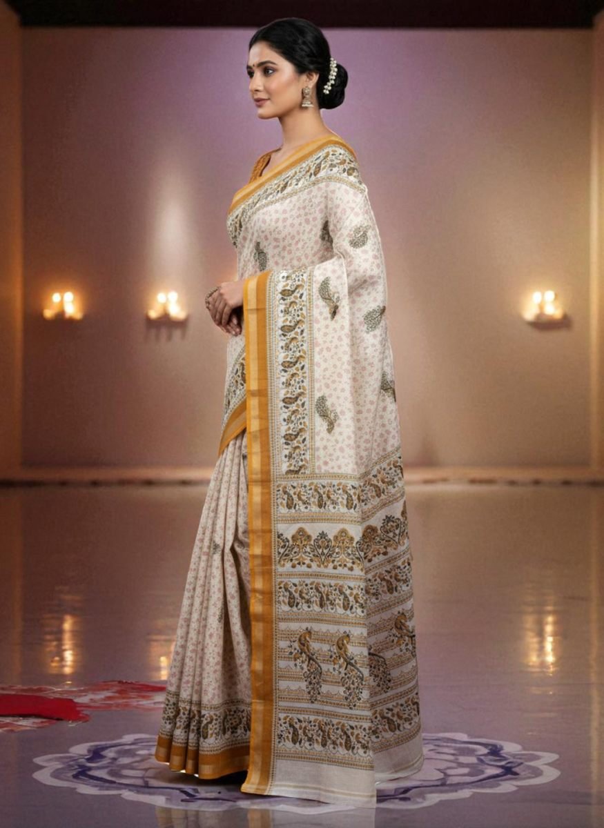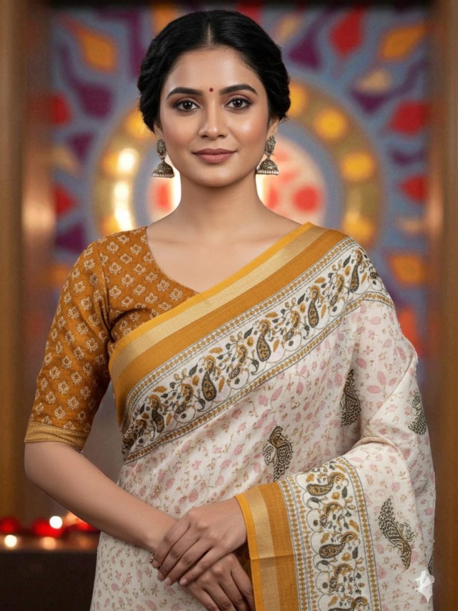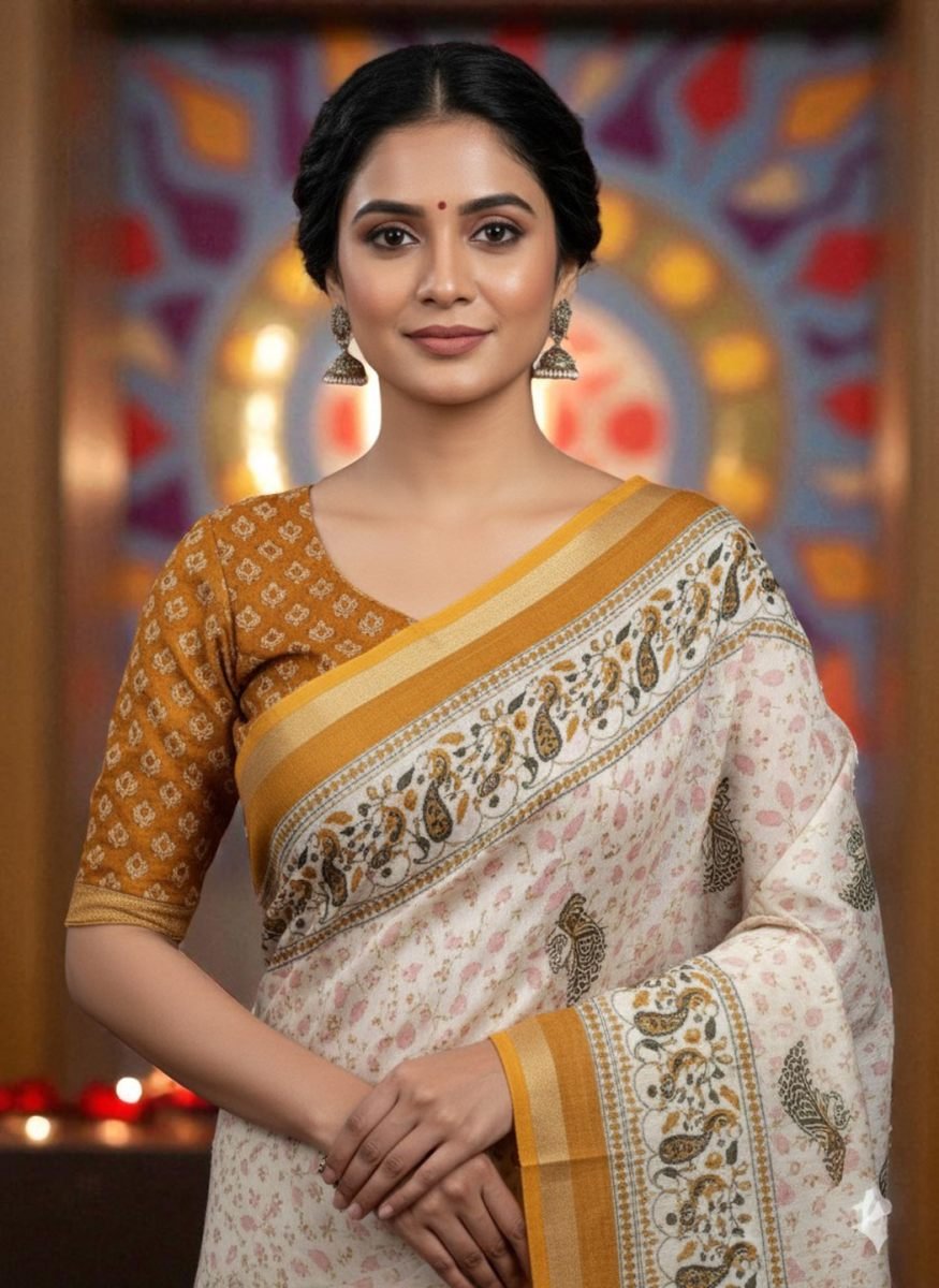 Material: 100% Pure Handloom Cotton Weave Type: Handloom Print Type: High-Resolution All-Over Digital Print Saree Length: 5.5 Meters Blouse Piece: Yes, an attached 0.8-meter blouse piece with a matching print. Weight: Lightweight Feel: Soft, comfortable, and breathable fabric. Easy to drape. Care Instructions: Gentle hand washing in cold water with mild detergent is recommended. Do not bleach or wring. Dry in a shaded area to preserve the colors. Use a warm iron. Occasion: Office Wear, Daily Wear, Casual Outings, Festive Brunches, Small Gatherings. Package Contains: 1 Saree with Attached Blouse Piece. Disclaimer: Product color may slightly vary due to photographic lighting sources or your monitor settings. Minor irregularities are a characteristic of the handloom weaving process and add to the product's charm. Woven by skilled artisans, the pure cotton fabric is the soul of this saree. It is incredibly lightweight, soft against the skin, and exceptionally breathable, making it a perfect companion for the Indian climate. The inherent texture of handloom adds a touch of authenticity and character that machine-made fabrics cannot replicate. Enjoy comfort that lasts all day, whether you're in an office meeting or at a casual get-together.