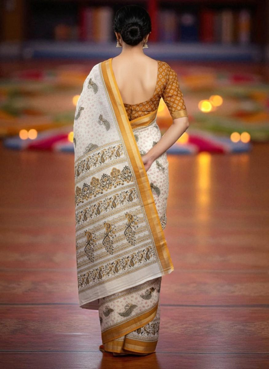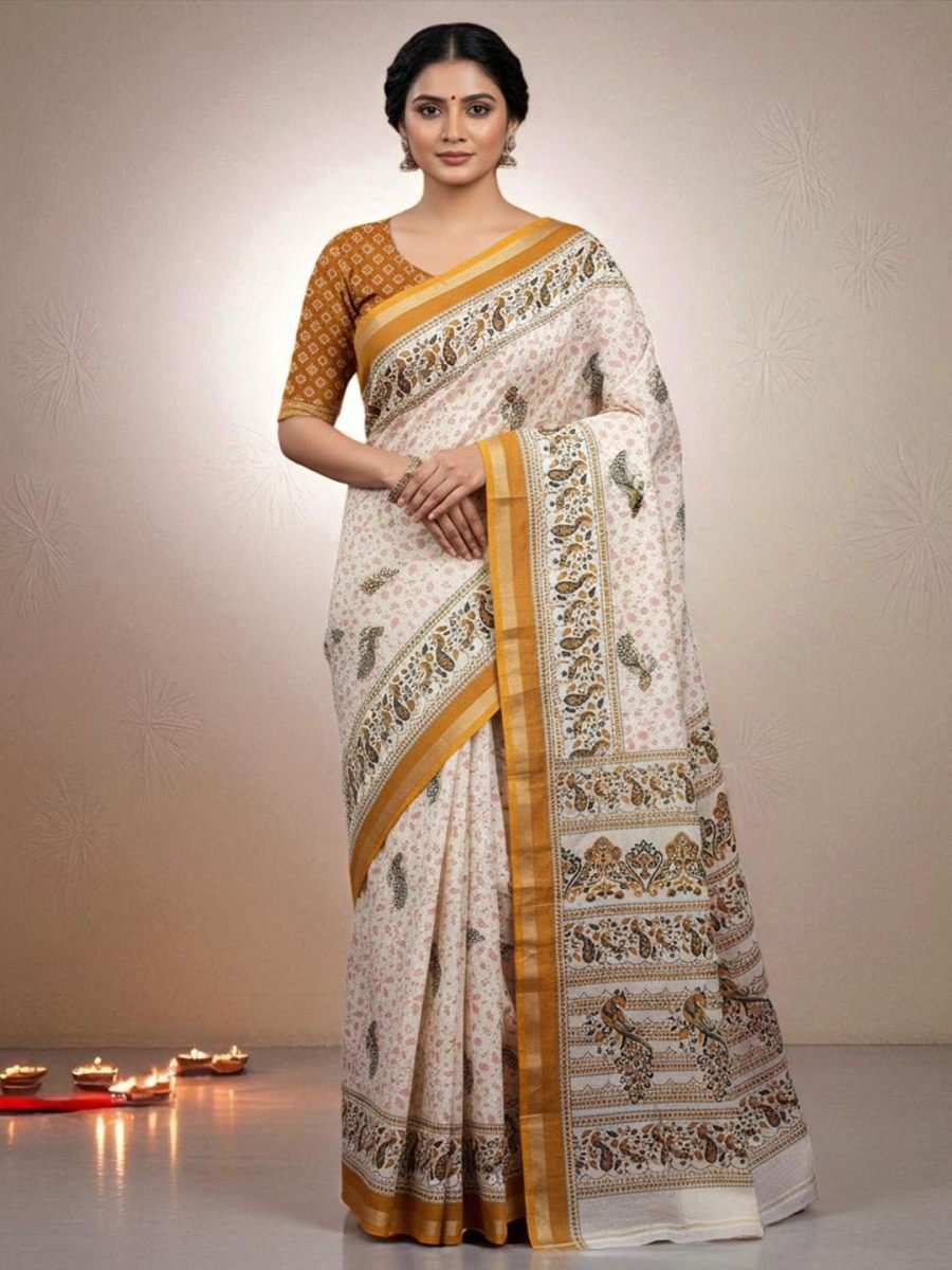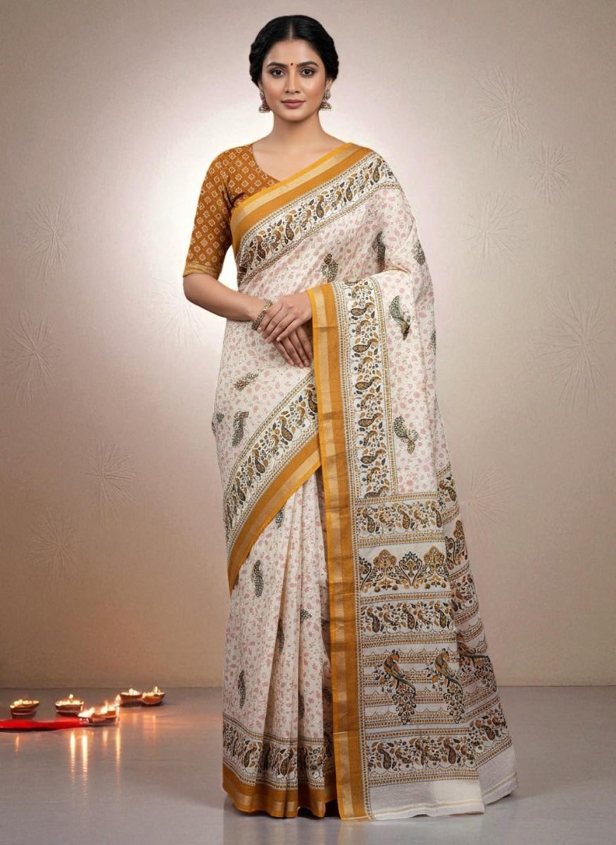 Material: 100% Pure Handloom Cotton Weave Type: Handloom Print Type: High-Resolution All-Over Digital Print Saree Length: 5.5 Meters Blouse Piece: Yes, an attached 0.8-meter blouse piece with a matching print. Weight: Lightweight Feel: Soft, comfortable, and breathable fabric. Easy to drape. Care Instructions: Gentle hand washing in cold water with mild detergent is recommended. Do not bleach or wring. Dry in a shaded area to preserve the colors. Use a warm iron. Occasion: Office Wear, Daily Wear, Casual Outings, Festive Brunches, Small Gatherings. Package Contains: 1 Saree with Attached Blouse Piece. Disclaimer: Product color may slightly vary due to photographic lighting sources or your monitor settings. Minor irregularities are a characteristic of the handloom weaving process and add to the product's charm. Woven by skilled artisans, the pure cotton fabric is the soul of this saree. It is incredibly lightweight, soft against the skin, and exceptionally breathable, making it a perfect companion for the Indian climate. The inherent texture of handloom adds a touch of authenticity and character that machine-made fabrics cannot replicate. Enjoy comfort that lasts all day, whether you're in an office meeting or at a casual get-together.