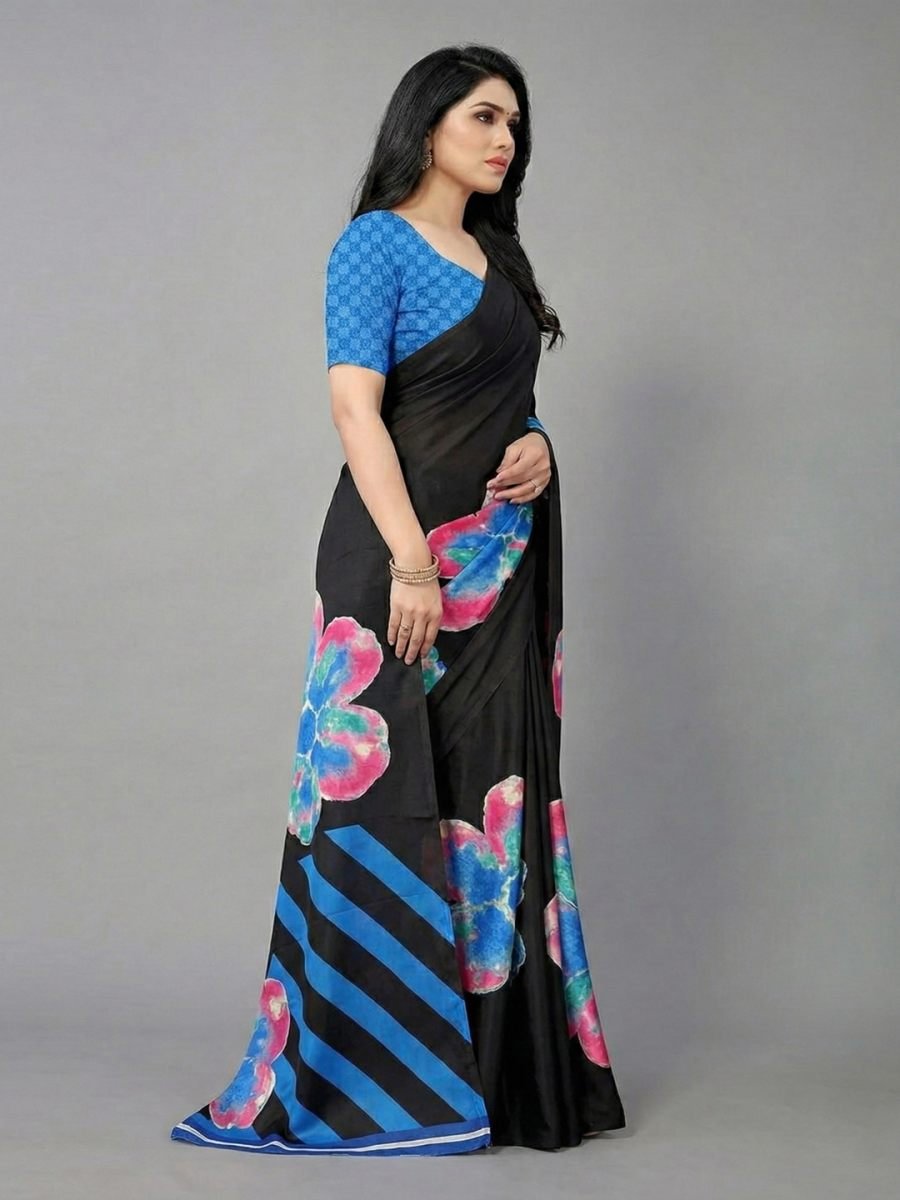 Detailed Product Description Elevate your style quotient with this stunning Satin Silk Saree, designed for the modern woman who loves a blend of tradition and trend. Crafted from premium quality satin silk, this saree boasts a glossy texture and a butter-soft feel against the skin, ensuring maximum comfort throughout the day. The highlight of this drape is its exquisite Digital Print, featuring a unique fusion of artistic floral motifs on the body and bold, diagonal geometric stripes on the pallu. This contrast creates a striking visual appeal that is perfect for any occasion. Whether you are heading to a kitty party, a corporate event, or a casual dinner, the lightweight and flowy nature of the fabric ensures a flattering silhouette and easy draping. The saree comes paired with a contrasting unstitched blouse piece that can be styled to your preference. Add this versatile masterpiece to your wardrobe and make heads turn wherever you go.