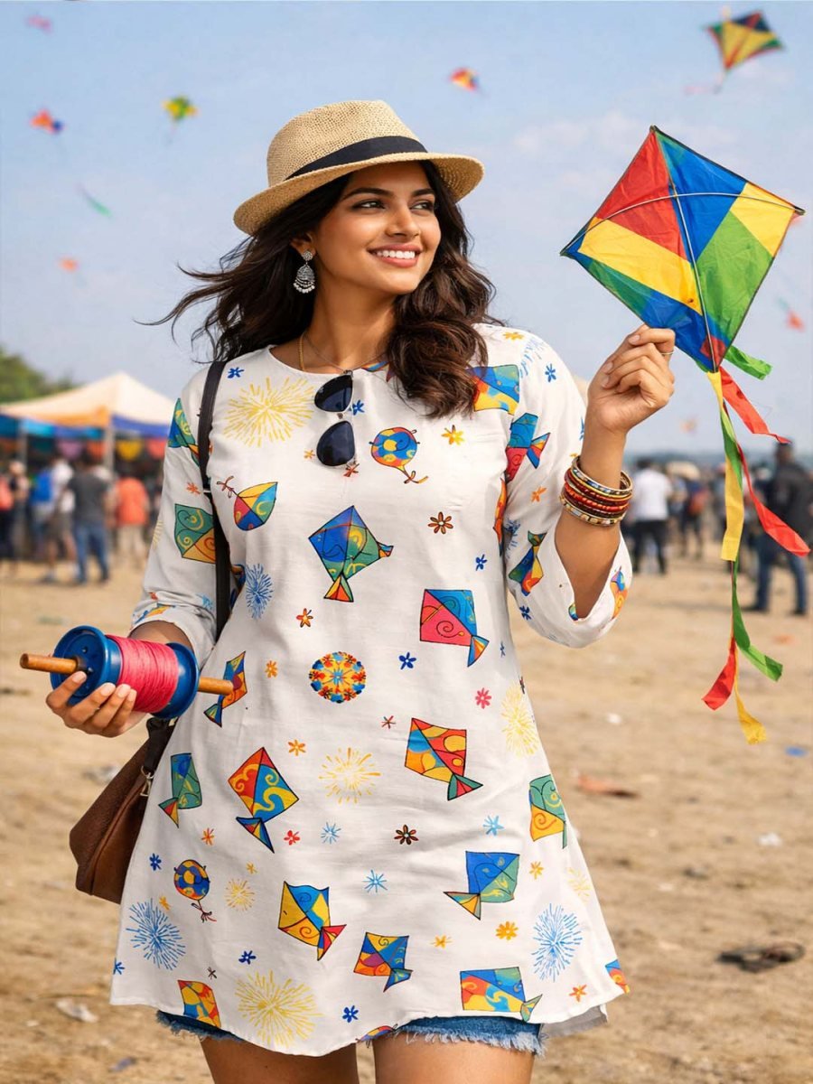Fabric: Premium Cotton Blend (Soft, breathable, and wrinkle-resistant) Color: Crisp White with Multi-color Kite Prints Sleeve Length: 3/4th Sleeves Neckline: Key-Hole Neck Style Size: S, M, L Length: Short Length (Above Knee) Pattern: Festival-themed Kite Fly Print Fit: Regular Fit / Straight Cut Occasion: Makar Sankranti, Uttarayan, Kite Festival, Casual Festive Wear Wash Care: Hand wash or gentle machine wash; iron on reverse. Breathable Comfort: The cotton blend fabric ensures you stay fresh during outdoor celebrations. Versatile Styling: Can be styled as a traditional tunic or a fusion kurti with jeans. Sun Protection: 3/4th sleeves provide coverage for outdoor daytime events. Elevate your festive wardrobe this Makar Sankranti and Uttarayan with our specially crafted Kite Fly Pattern White Kurti. Designed for the woman who loves to celebrate with spirit and style, this kurti is made from a breathable cotton blend fabric that keeps you cool and comfortable during long hours on the terrace.