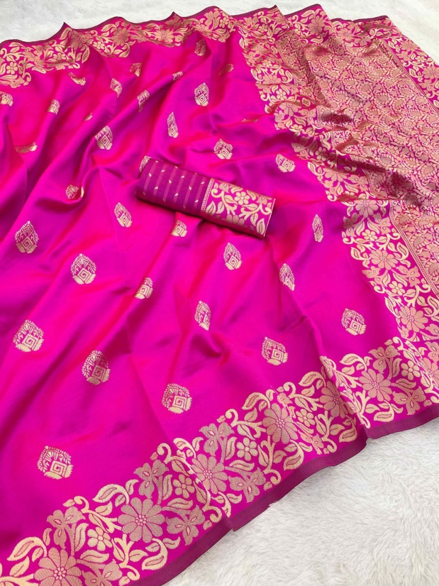 Fabric (Saree): Pure Silk Work/Design: Woven Banarasi Jacquard Design Saree Length: 5.5 Meters Blouse Piece Length: 0.8 Meters (Unstitched) Texture: Smooth, lustrous, lightweight drape Occasion: Wedding, Festival, Party, Traditional, Cultural Events Style Tip: Pair with gold jewelry and embellished clutch for a regal look Wash Care: Dry Clean Only Indulge in timeless elegance with this Woven Banarasi Jacquard Pure Silk Saree, crafted to perfection for the modern woman who loves tradition with a touch of luxury. Designed with rich Banarasi weaving and intricate jacquard patterns, this saree is a true masterpiece that reflects the heritage of Indian handloom artistry. The smooth texture of pure silk ensures a graceful drape, while the luminous sheen enhances its royal charm.