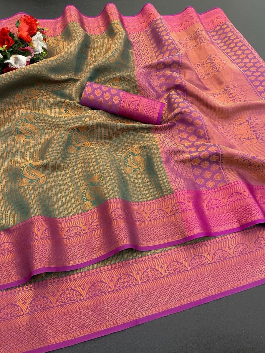 * Fabric: Soft Silk * Design: Kanjivaram Soft Copper Zari Work * Saree Length: 5.5 meters * Blouse Piece Length: 0.8 meters * Product Description: The Banarasi Softy Copper Zari Weaving Kanjivaram Silk Saree is a luxurious blend of Banarasi and Kanjivaram weaving traditions. Crafted from premium silk, it features intricate copper zari work, exuding elegance and grandeur. Perfect for weddings and festive occasions, this saree showcases timeless craftsmanship with rich textures and exquisite patterns.