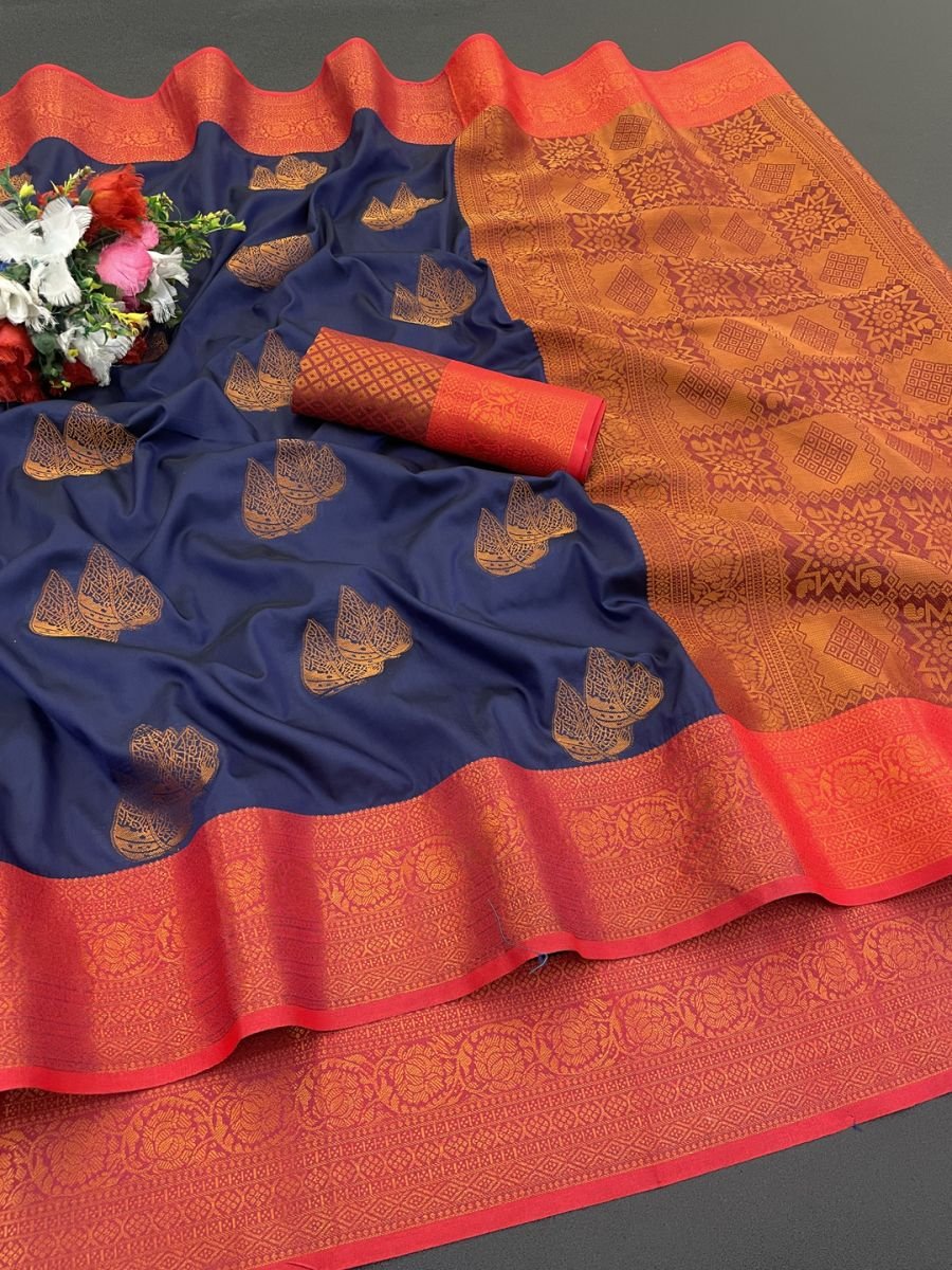 * Fabric: Soft Silk * Design: Kanjivaram Soft Copper Zari Work * Saree Length: 5.5 meters * Blouse Piece Length: 0.8 meters * Product Description: The Banarasi Softy Copper Zari Weaving Kanjivaram Silk Saree is a luxurious blend of Banarasi and Kanjivaram weaving traditions. Crafted from premium silk, it features intricate copper zari work, exuding elegance and grandeur. Perfect for weddings and festive occasions, this saree showcases timeless craftsmanship with rich textures and exquisite patterns.